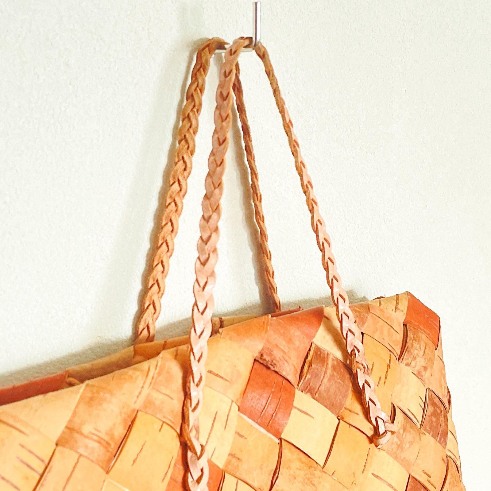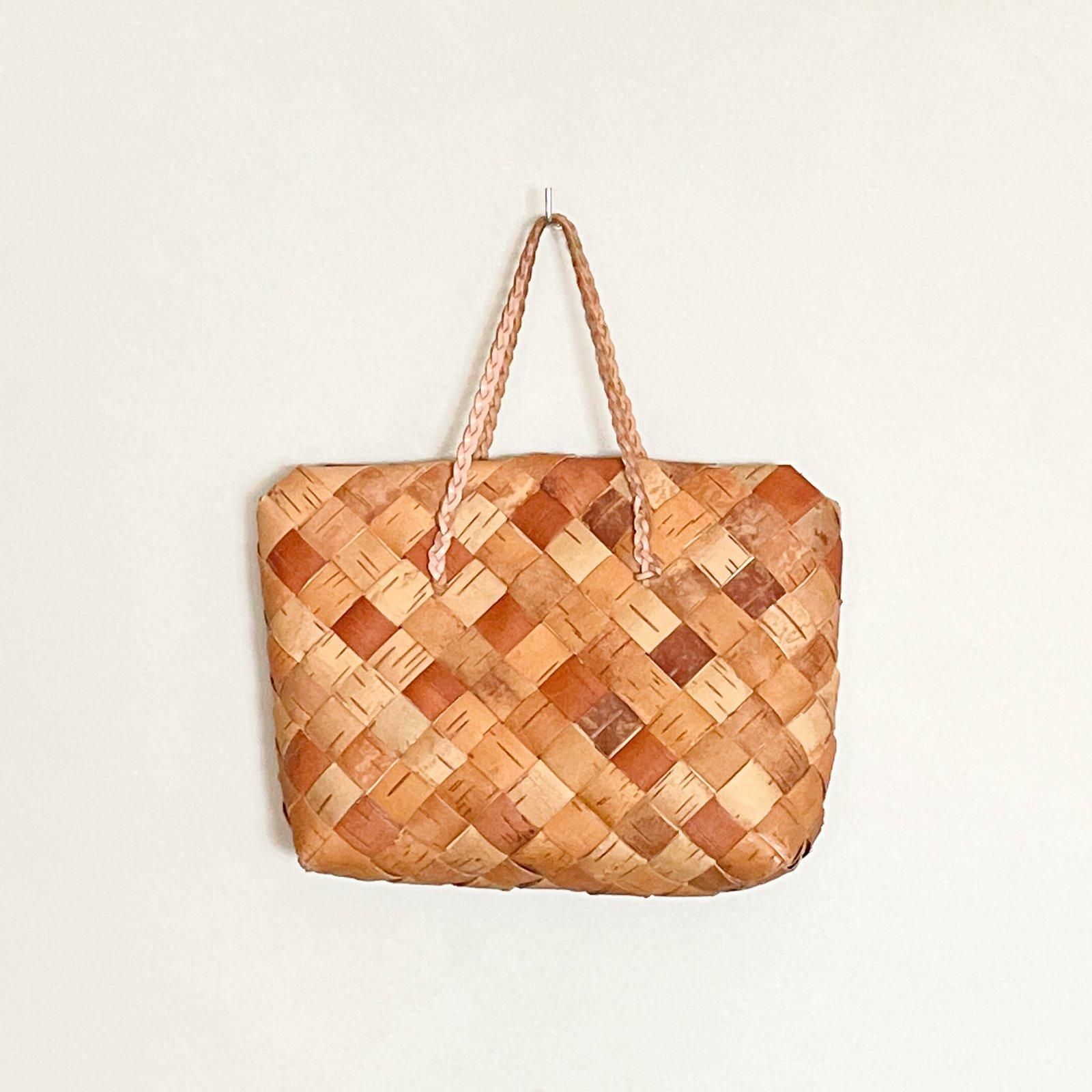 スウェーデンのヴィンテージのバスケットです。白樺の樹皮を格子状に編んでハンドバッグに仕立てられています。ハンドルは細いレザーを編み込んだ華奢なデザイン。白樺バッグのハンドルには平たいレザーを合わせられますが、編まれたレザーハンドルは珍しく、チャームポイントになっています。底面には作者の方のイニシャルと製作年が刻まれています。