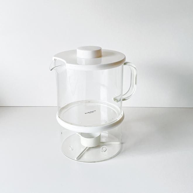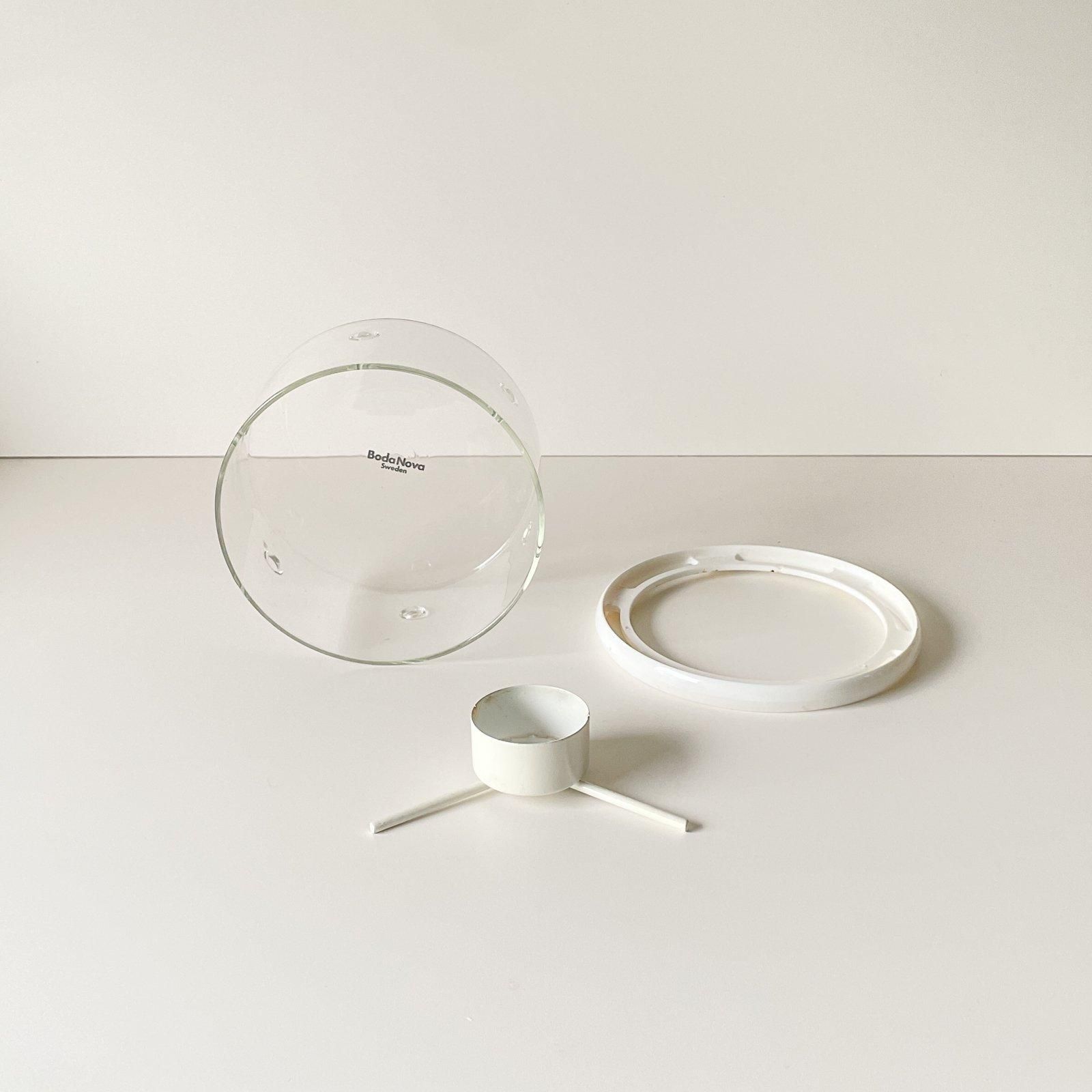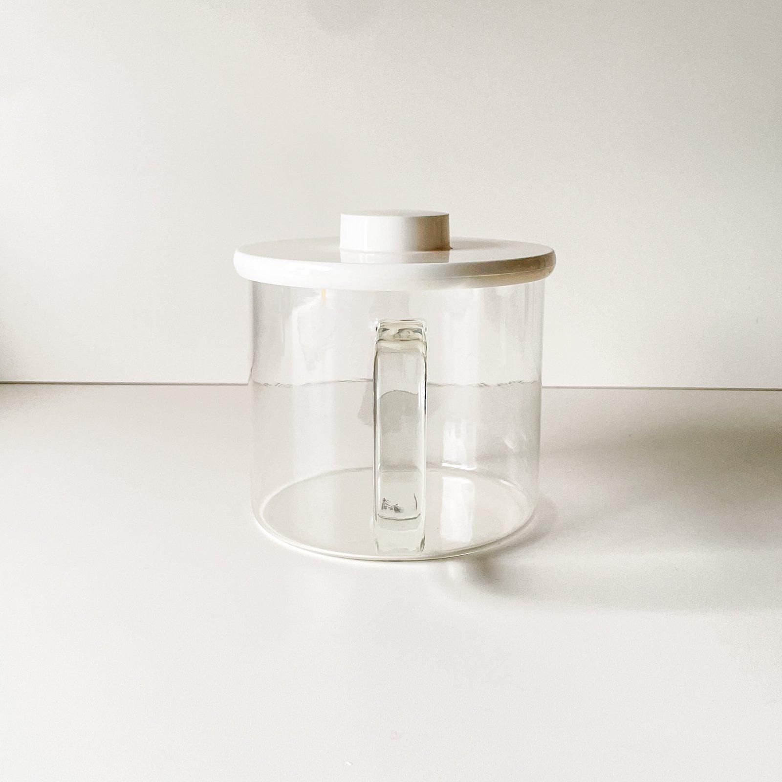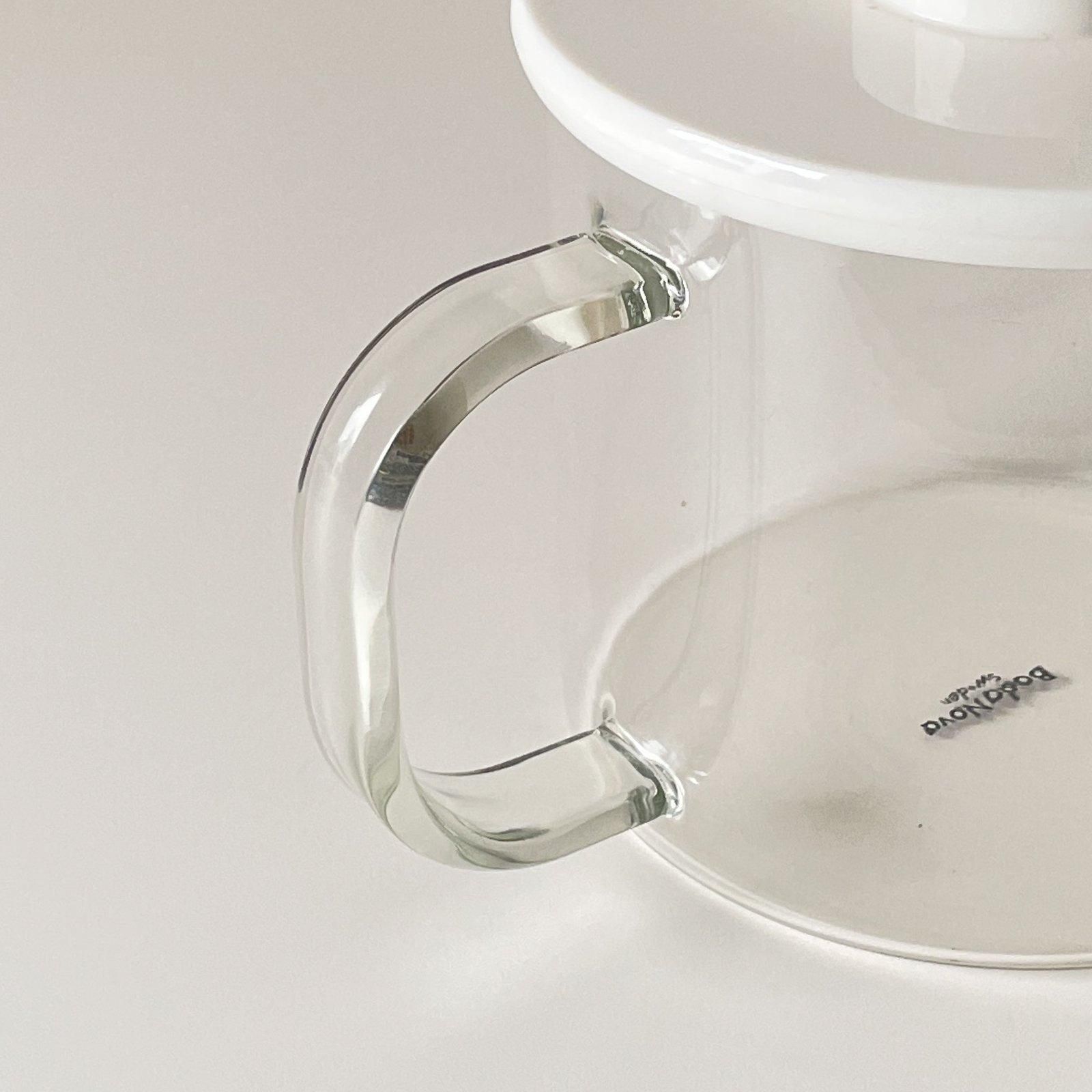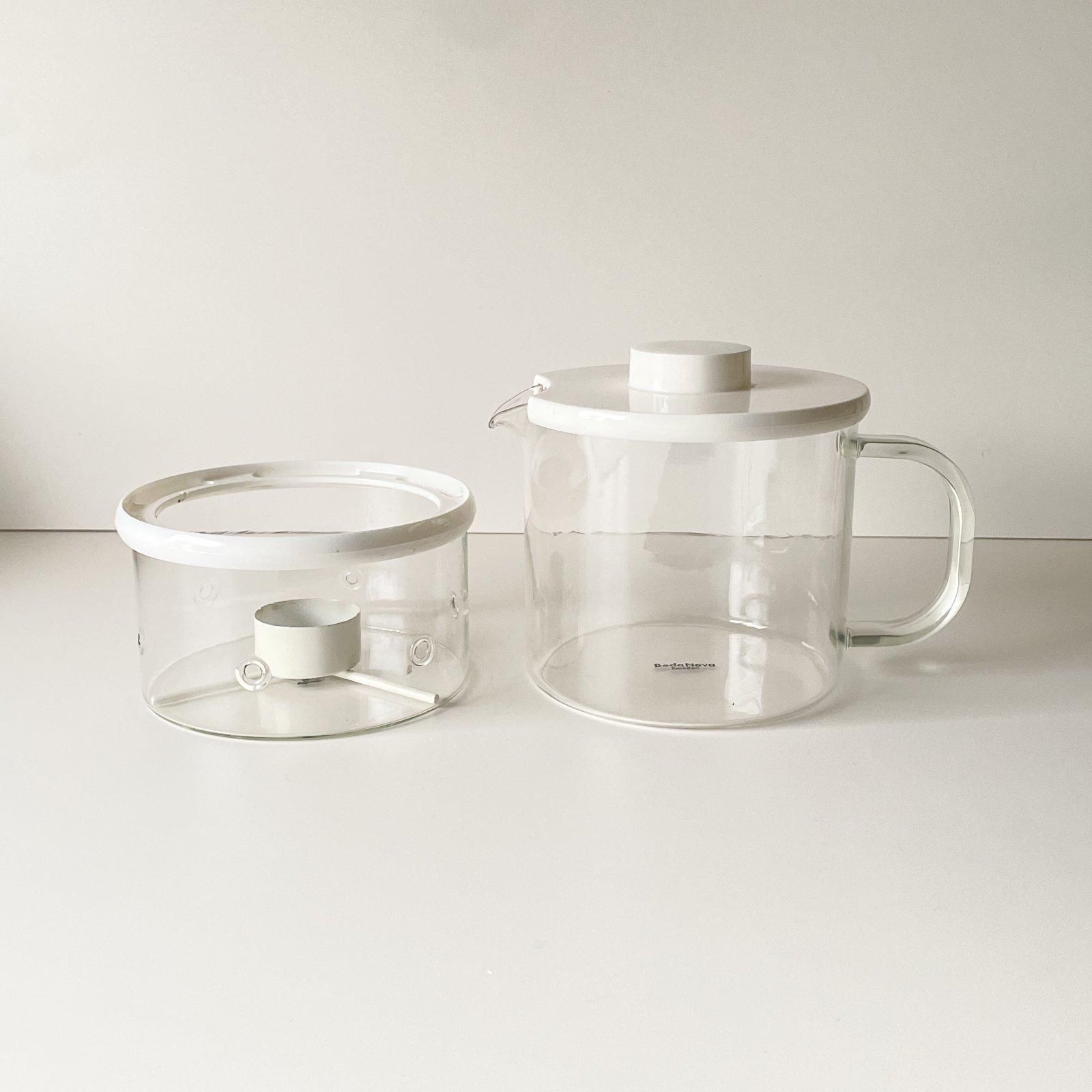 スウェーデンのプロダクトデザイナー、シグネ・ペーション・メリンがデザインし、1970年代にBODA NOVA 社から発売されていた、耐熱ガラスのティーポットとウォーマーのセットです。円柱形のすっきりとしたデザインで、フタとポットホルダー、キャンドルホルダーのホワイトが効かせ色となり、モダンで清潔感があります。