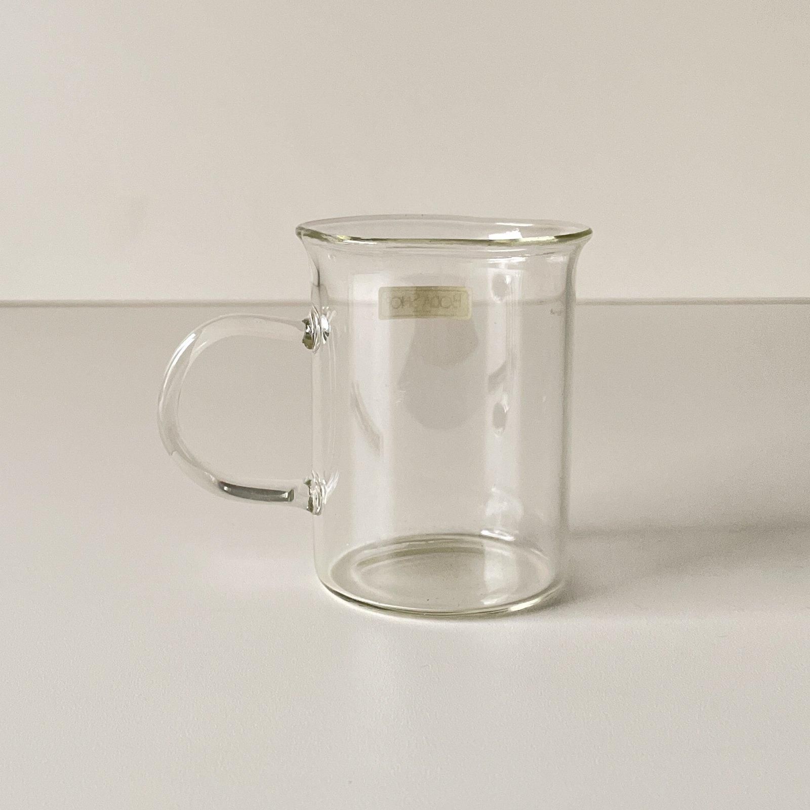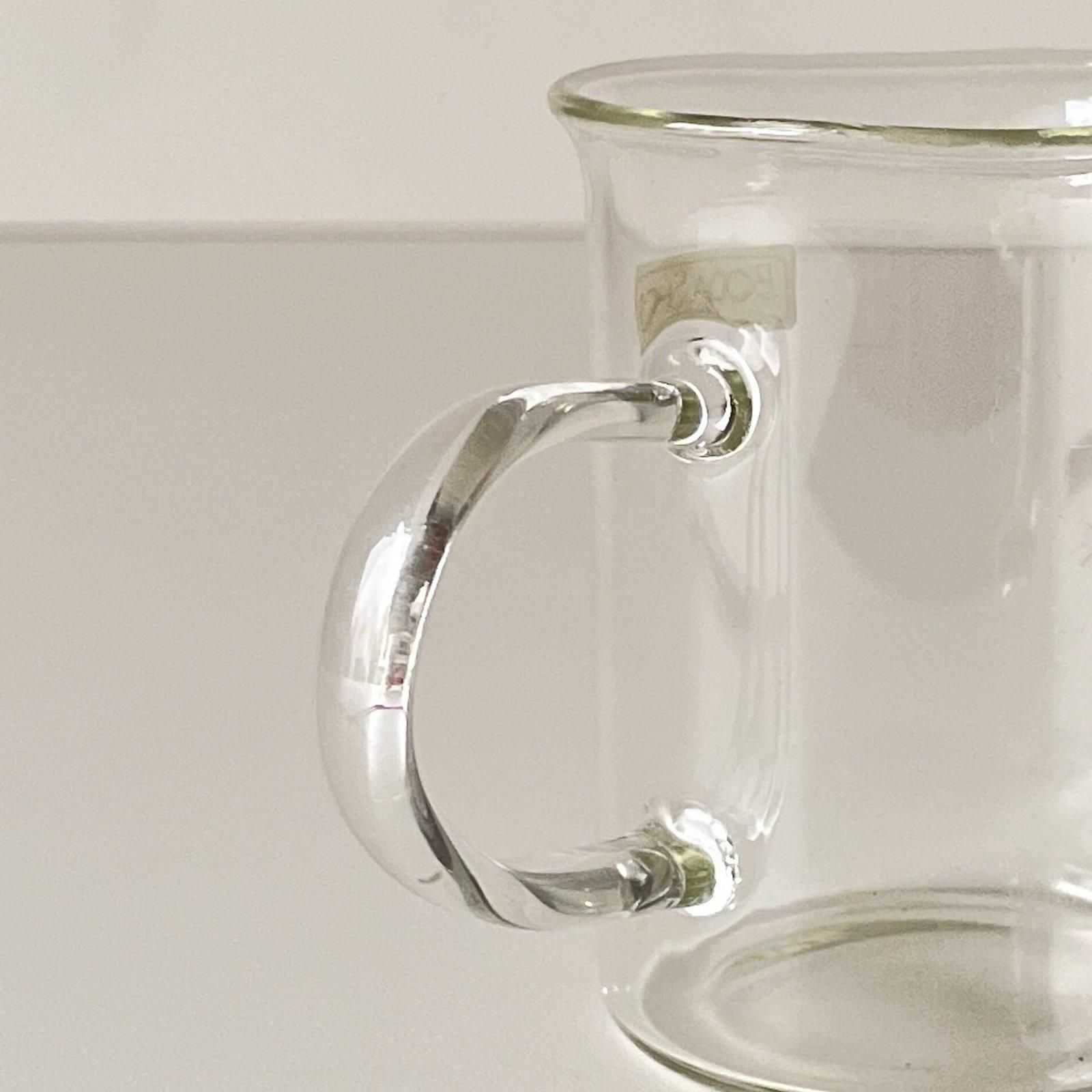 1970年代にBODA NOVAから発売された、耐熱ガラスのミニサイズのマグカップと赤いプラスティックのマドラーのセットです。もともとはグレッグというスウェーデンでクリスマスシーズンに飲まれるホットワイン用に作られたものです。型に流し入れて作られたグラスは薄くて軽いのが特徴です。円柱形の本体は口元が開いて飲みやすく、ハンドル大きめのもちやすいデザインです。