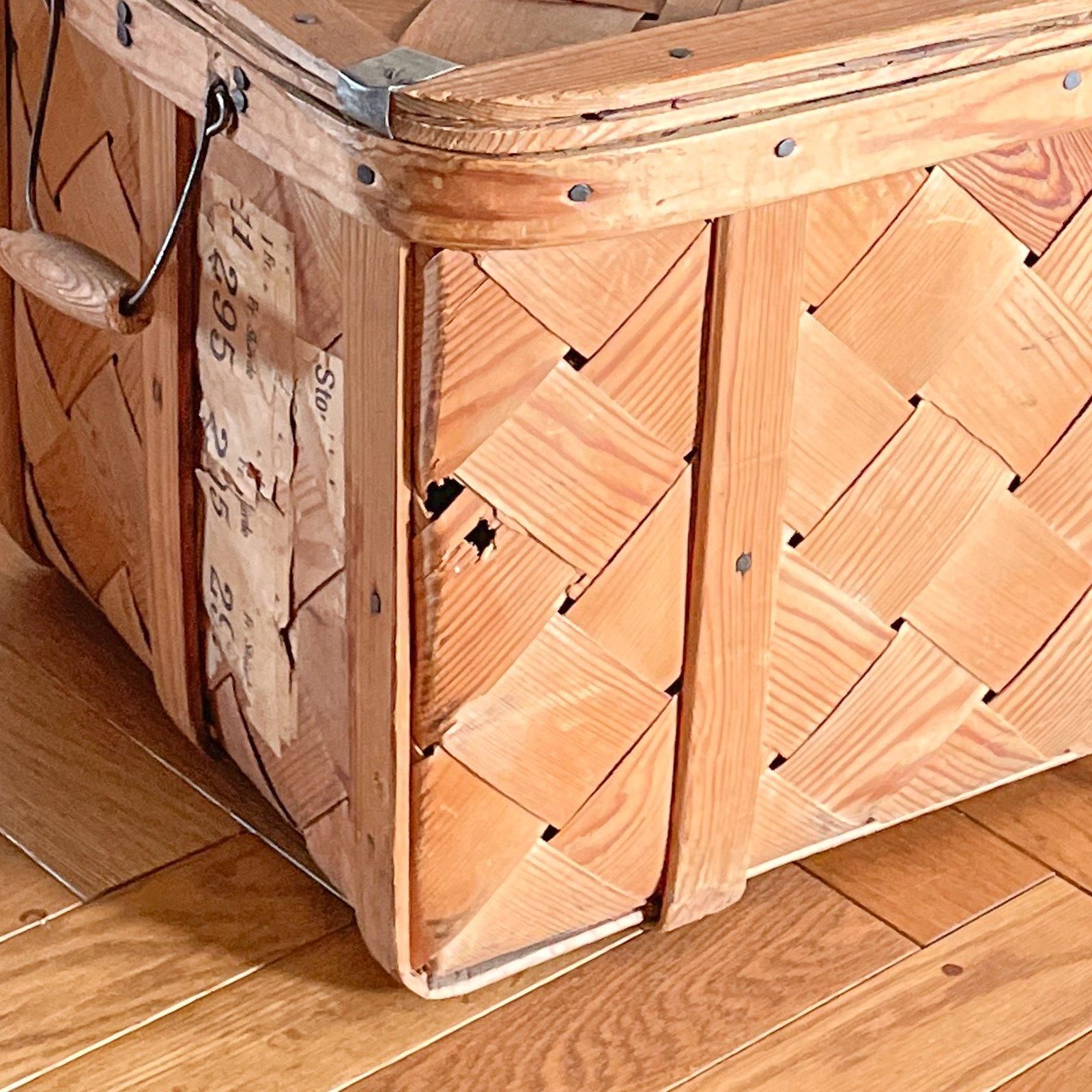 スウェーデン製のヴィンテージバスケットです。スウェーデンでは「スポンコリ」と呼ばれ、昔から収納カゴとして親しまれ、旅行時にはトランクとして電車に持ち込まれていたそうです。このスポンコリは実際、電車に持ち込まれたようで、側面に紙製の荷物タグが付けられています。その数字のフォントがまたいい雰囲気なので、外さずにこのまま販売いたします。