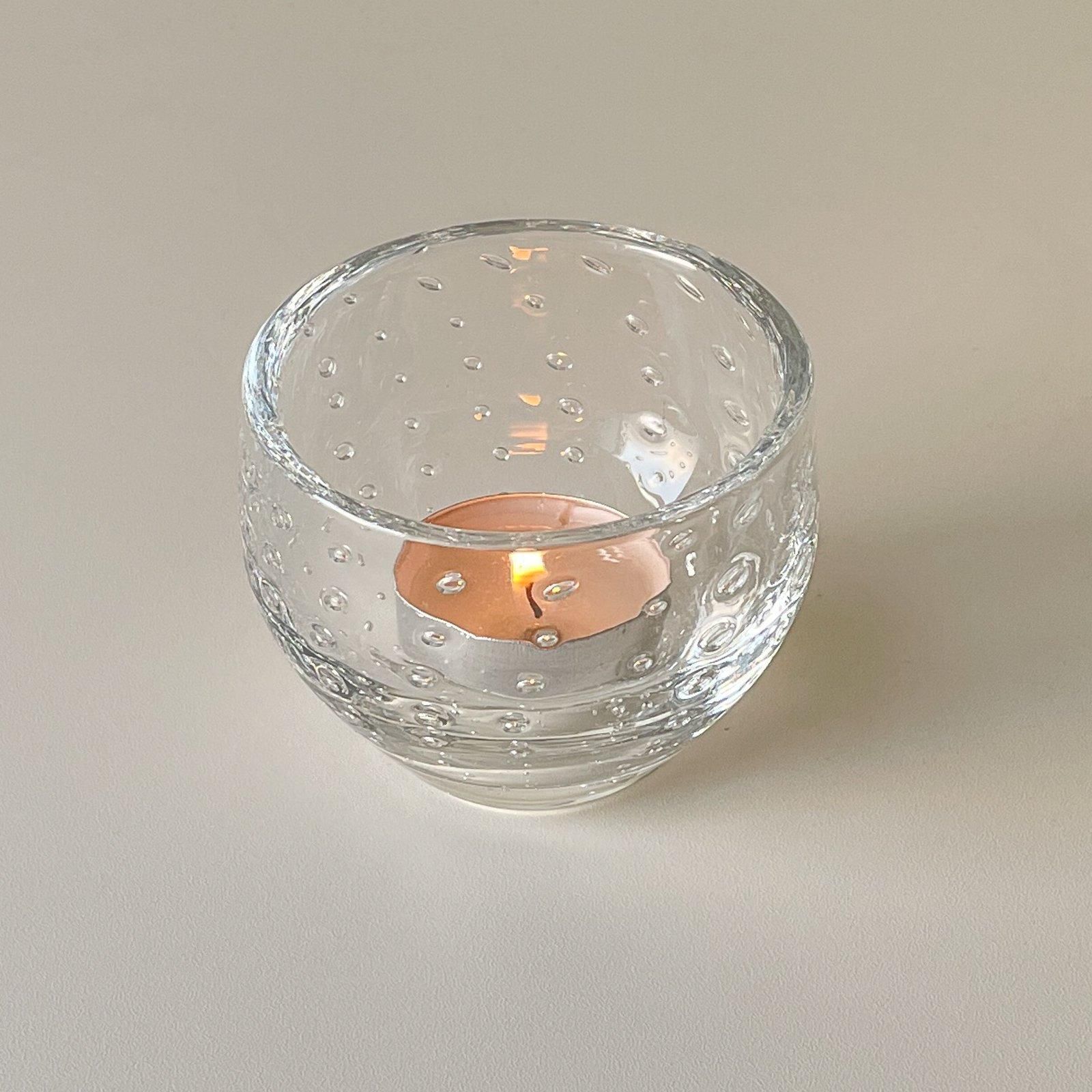 スウェーデン製のガラスのキャンドルホルダーです。ハンドメイドで作られた厚みのあるガラスに、気泡が縦に並んだデザインです。