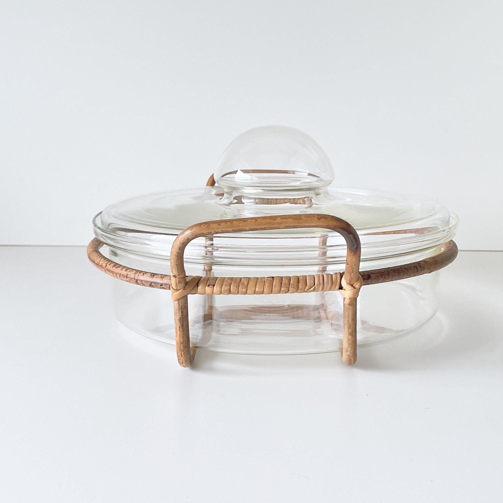 デンマークのキッチン用品メーカー・ボダム社で作られていた、耐熱ガラスのキャセロールと専用スタンドのセットです。キャセロールは直径24cmのたっぷりサイズで、フタの球体の持ち手が魅力的なデザイン。専用スタンドは藤製でしっかりしたつくりです。