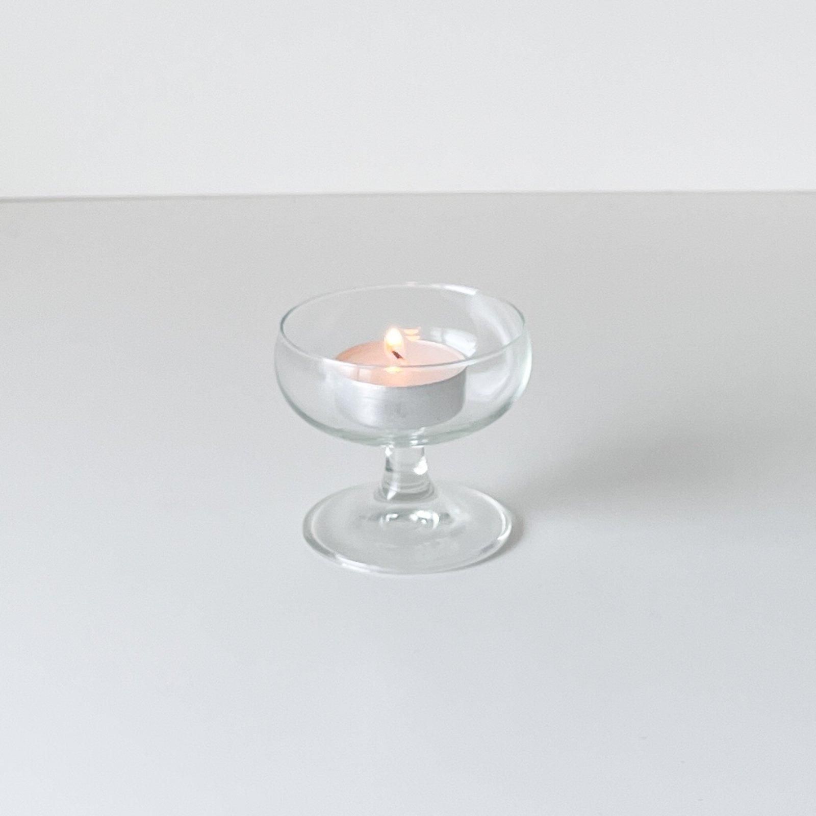 スウェーデンで作られていたヴィンテージのステムグラスです。開口が大きく低め、そこの直径も大きいため、安定感があります。直径が大きめなので、前菜やデザートなどを盛り付けるのもおすすめですし、画像のようにカップ入りキャンドルを灯すのもいいですね。
