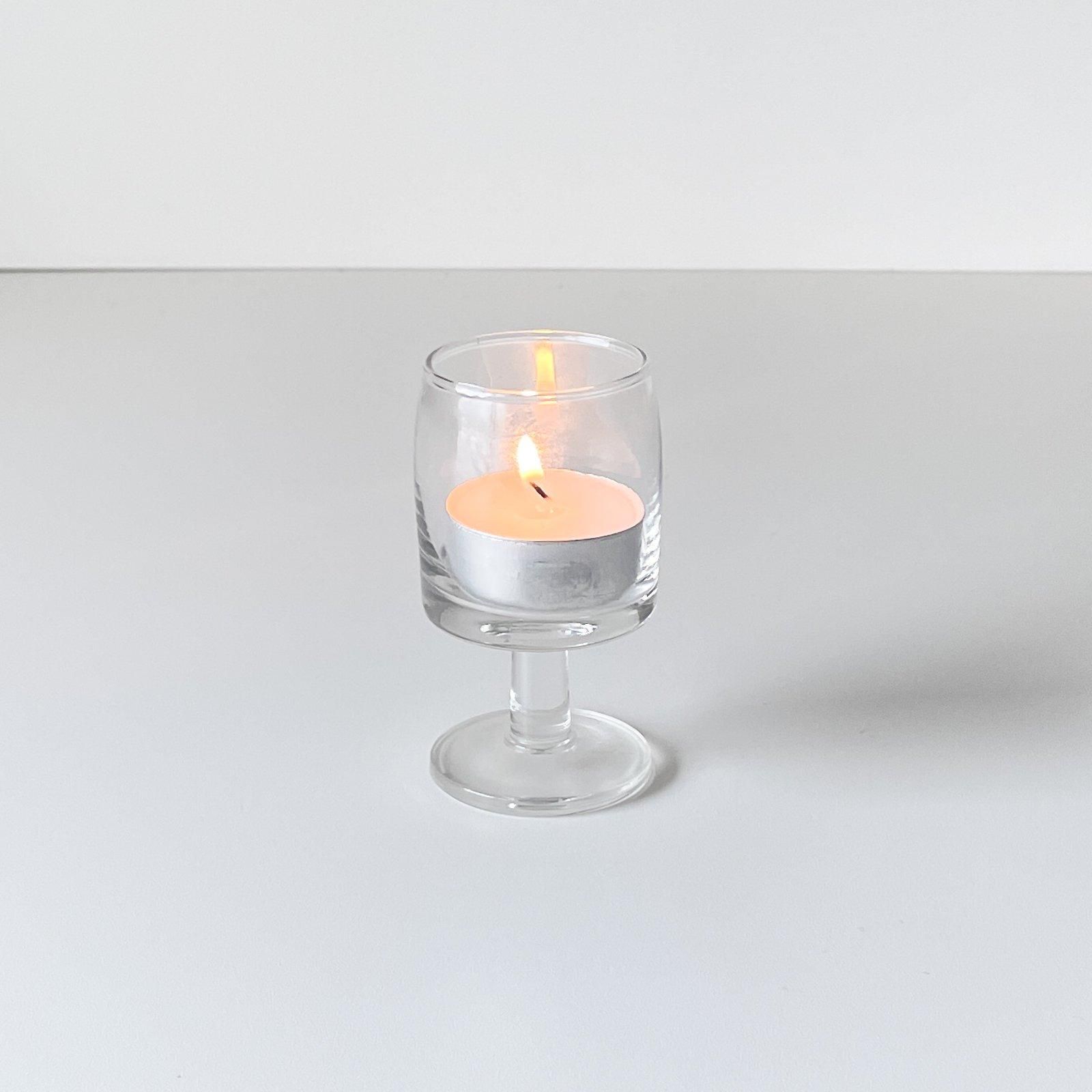 スウェーデンで作られていたヴィンテージのステムグラスです。円柱型で脚付きのシンプルでカジュアルなグラスです。食前酒をたのしむ他、画像のようにカップ入りキャンドルを灯すのもおすすめです。