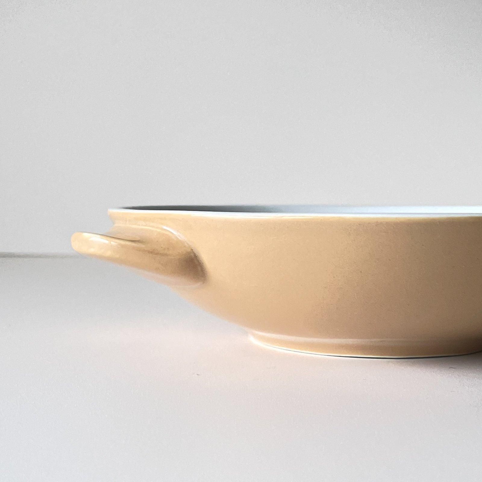 ARABIAのハンドル付きのスープ皿です。しっかりと厚みのあるスープ皿はハンドルと裏側はオレンジとベージュの間のような柔らかい色あいで、小さな持ち手が耳のようでかわいいデザインです。