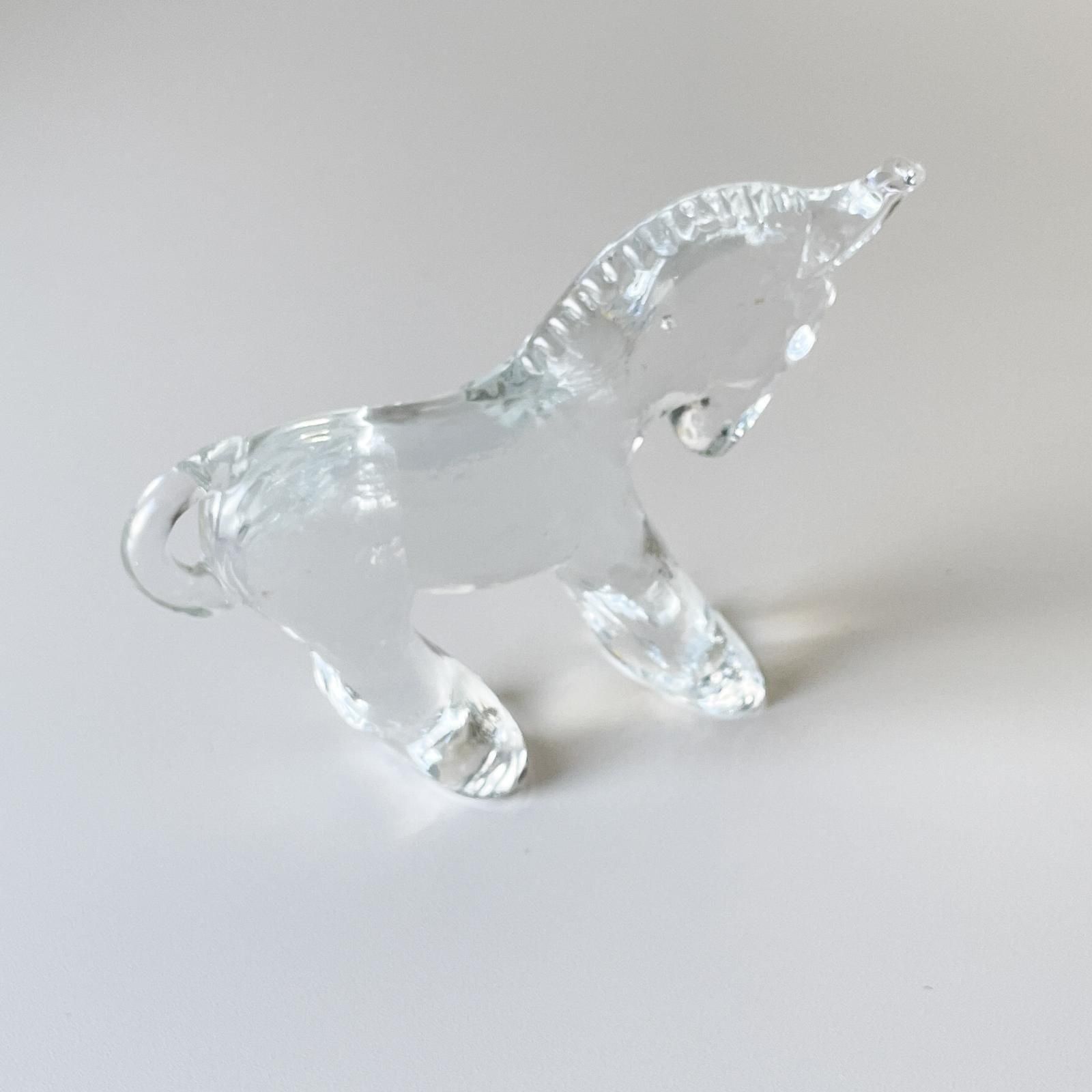スウェーデンの老舗ガラスメーカー・KOSTA BODA社で、1970年代に手作りされていたクリスタルガラスのポニーです。デザイナーはBertil Vallien | バーティル・ヴァリエンです。体を後に引いてうつむいたように見えるポニーはつぶらな瞳と立て髪もかわいらしくて、馬のやさしい表情をこまかく表現しています。ハンドメイドガラスのゆらぎもまたこの作品の魅力を引き立てています。裏面はフラットなのでペーパーウェイトとしても使えます。