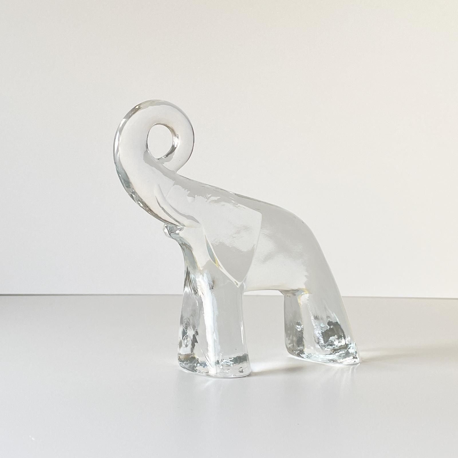 スウェーデンの老舗ガラスメーカー・KOSTA BODA社で1970年代に手作りされていたクリスタルガラスの象です。デザイナーはBertil Vallien | バーティル・ヴァリエンです。「パオーン」という鳴き声が聞こえてくるような、元気よく鼻をくるんと丸めた象の、耳や牙まで丁寧に表情されています。ハンドメイドガラスのゆらぎもまたこの作品の魅力を引き立てています。裏面はフラットなのでペーパーウェイトとしても使えます。