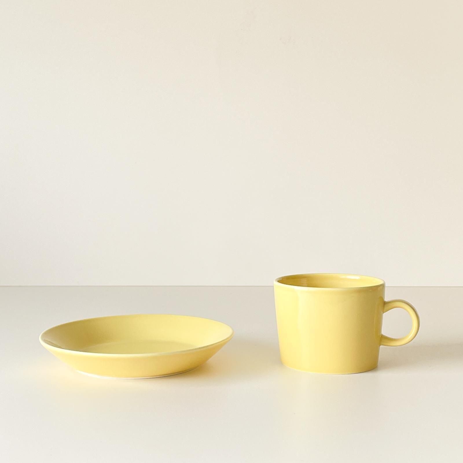 ARABIAのTEEMAシリーズのヴィンテージ、IITTALAロゴのカップ&ソーサーLサイズです。きれいなイエローが魅力的ですが、このイエローは現在では作られていない廃盤カラーなので貴重です。ソーサーはフラットなつくりなので、プレートとして単独使いができる点も感心させられるデザインです。