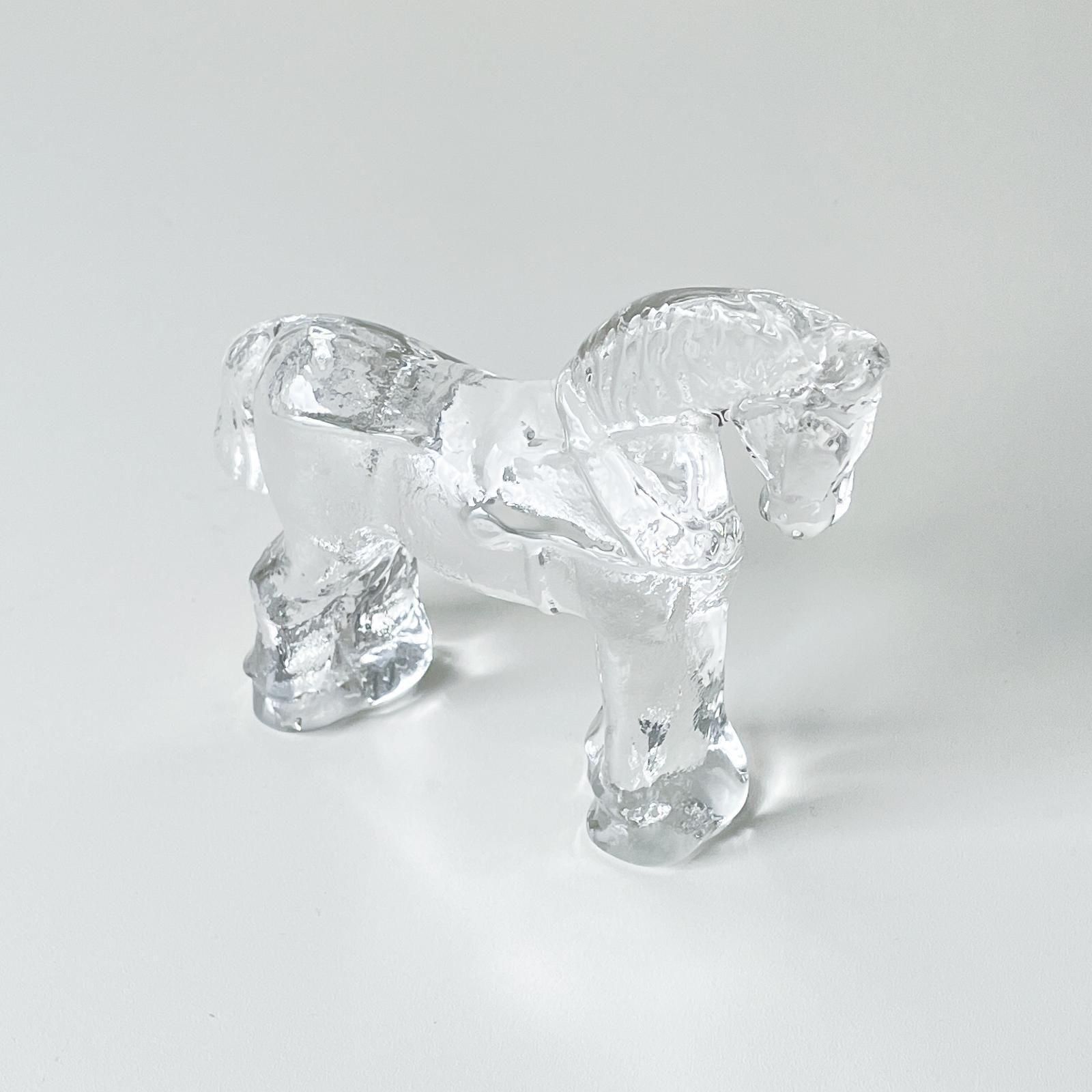 スウェーデンの老舗ガラスメーカー・KOSTA BODA社で1970年代に手作りされていたクリスタルガラスの馬です。デザイナーはBertil Vallien | バーティル・ヴァリエンです。うつむいたように見える馬の姿や、乗馬用の鞍が表現されています。ハンドメイドガラスのゆらぎもまたこの作品の魅力を引き立てています。裏面はフラットなのでペーパーウェイトとしても使えます。