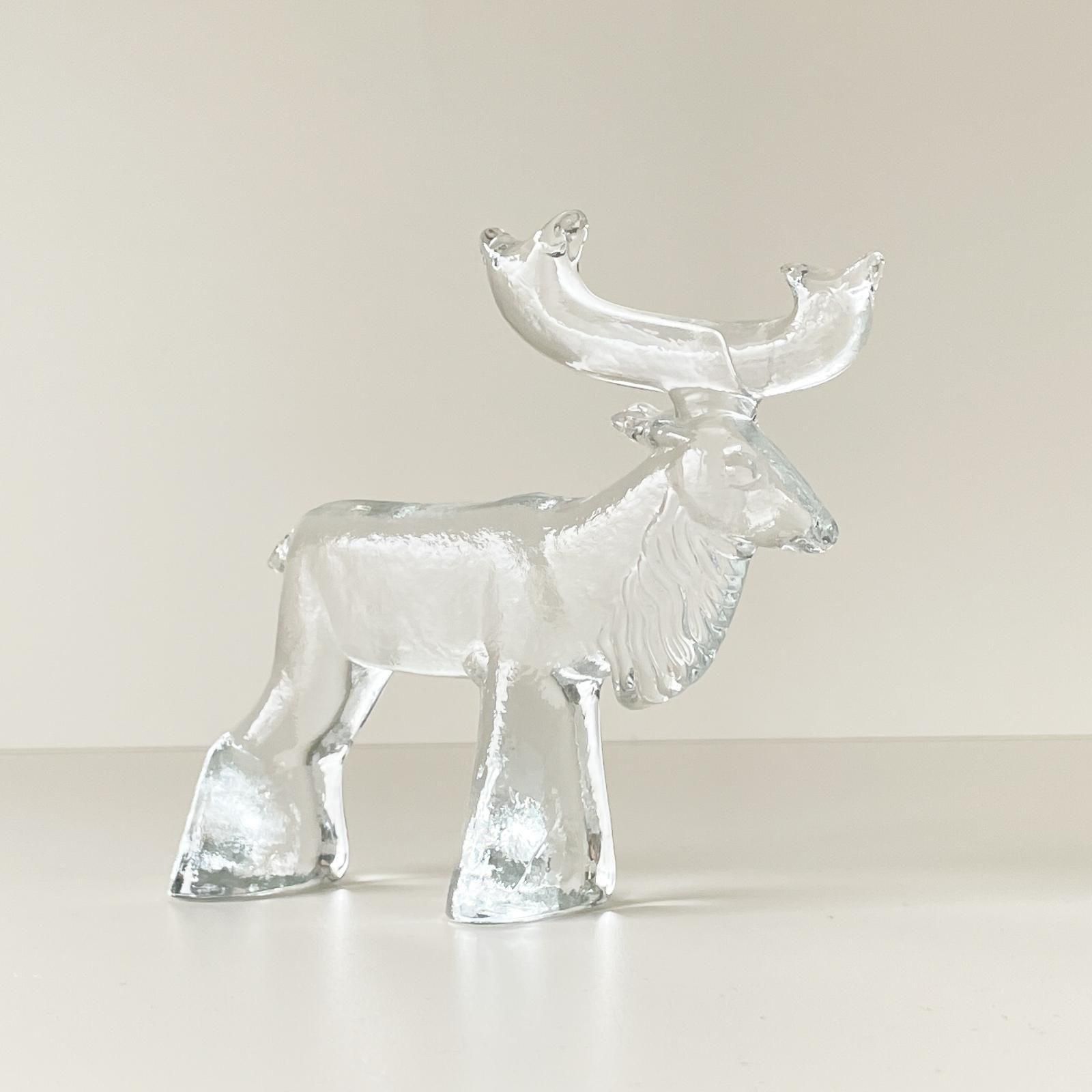 スウェーデンの老舗ガラスメーカー・KOSTA BODA社で1970年代に手作りされていたクリスタルガラスのトナカイです。デザイナーはBertil Vallien | バーティル・ヴァリエンです。まっすぐに伸びたツノや毛並み、そしてキリッとした表情まで、丁寧に表情されています。ハンドメイドガラスのゆらぎもまたこの作品の魅力を引き立てています。裏面はフラットなのでペーパーウェイトとしても使えます。