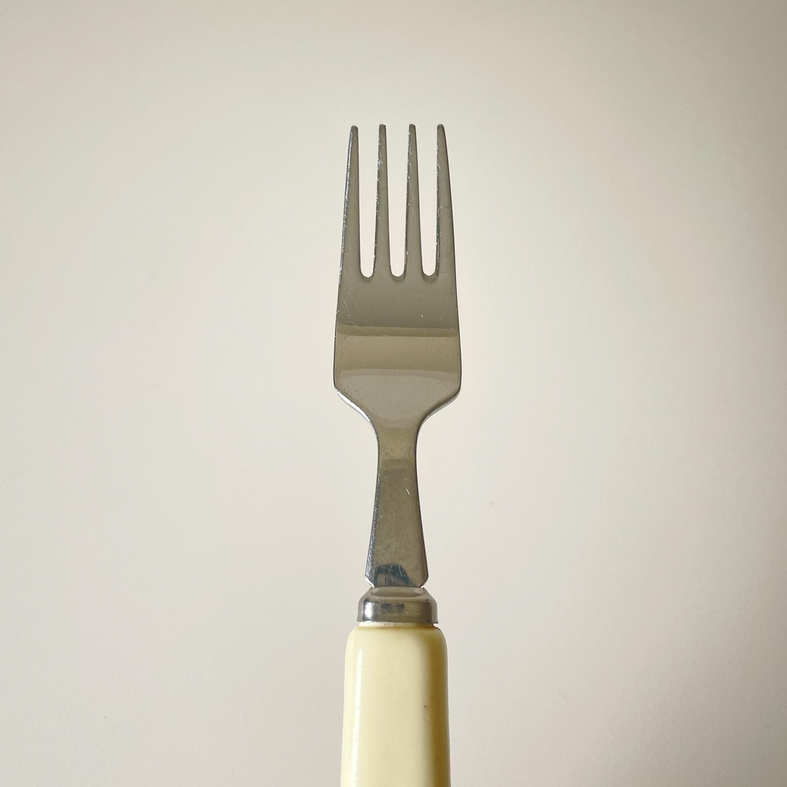 スウェーデンで1970年代に作られていたデザートフォークです。やさしいクリーム色の樹脂のハンドルが魅力的なフォークです。おそろいのデザートナイフもあります。