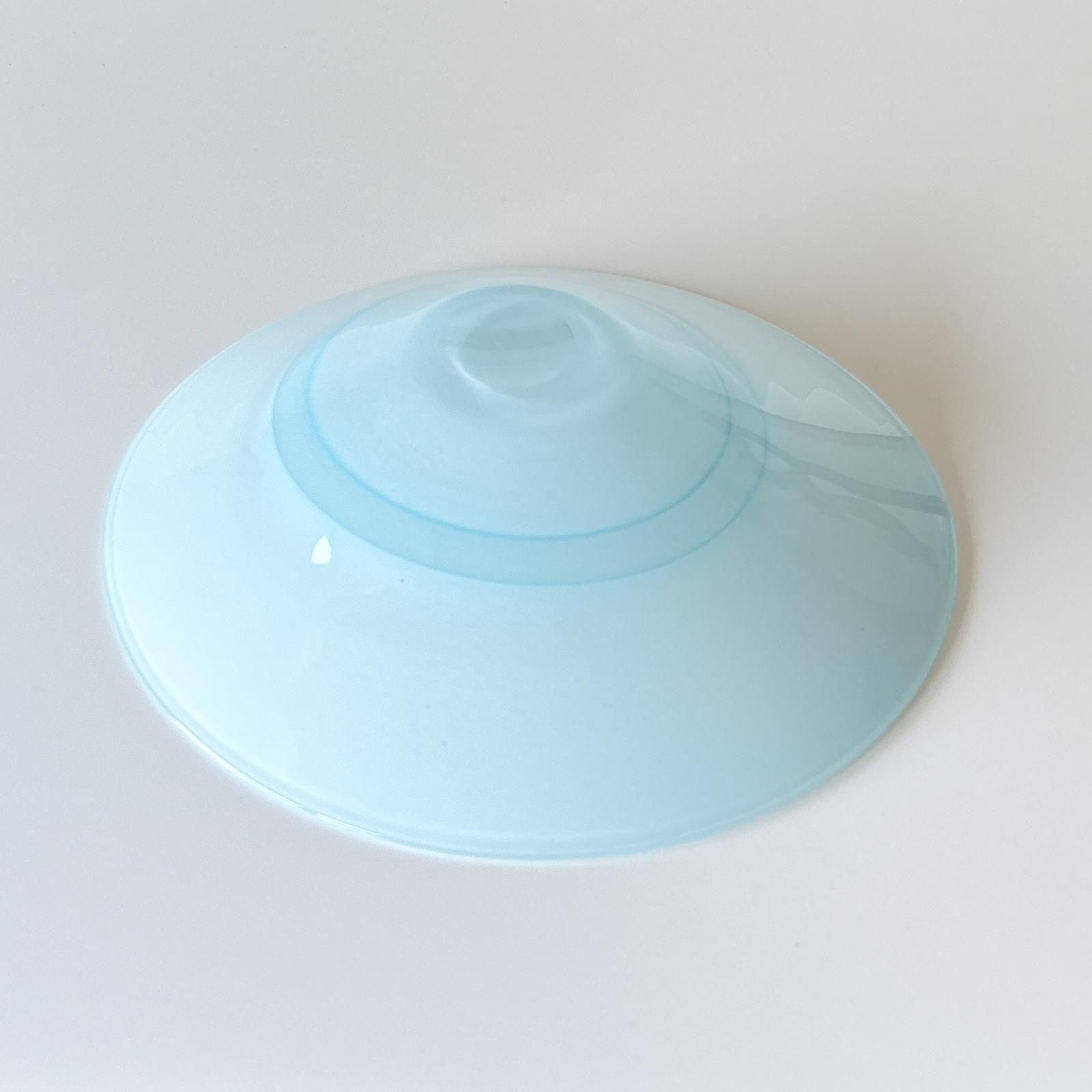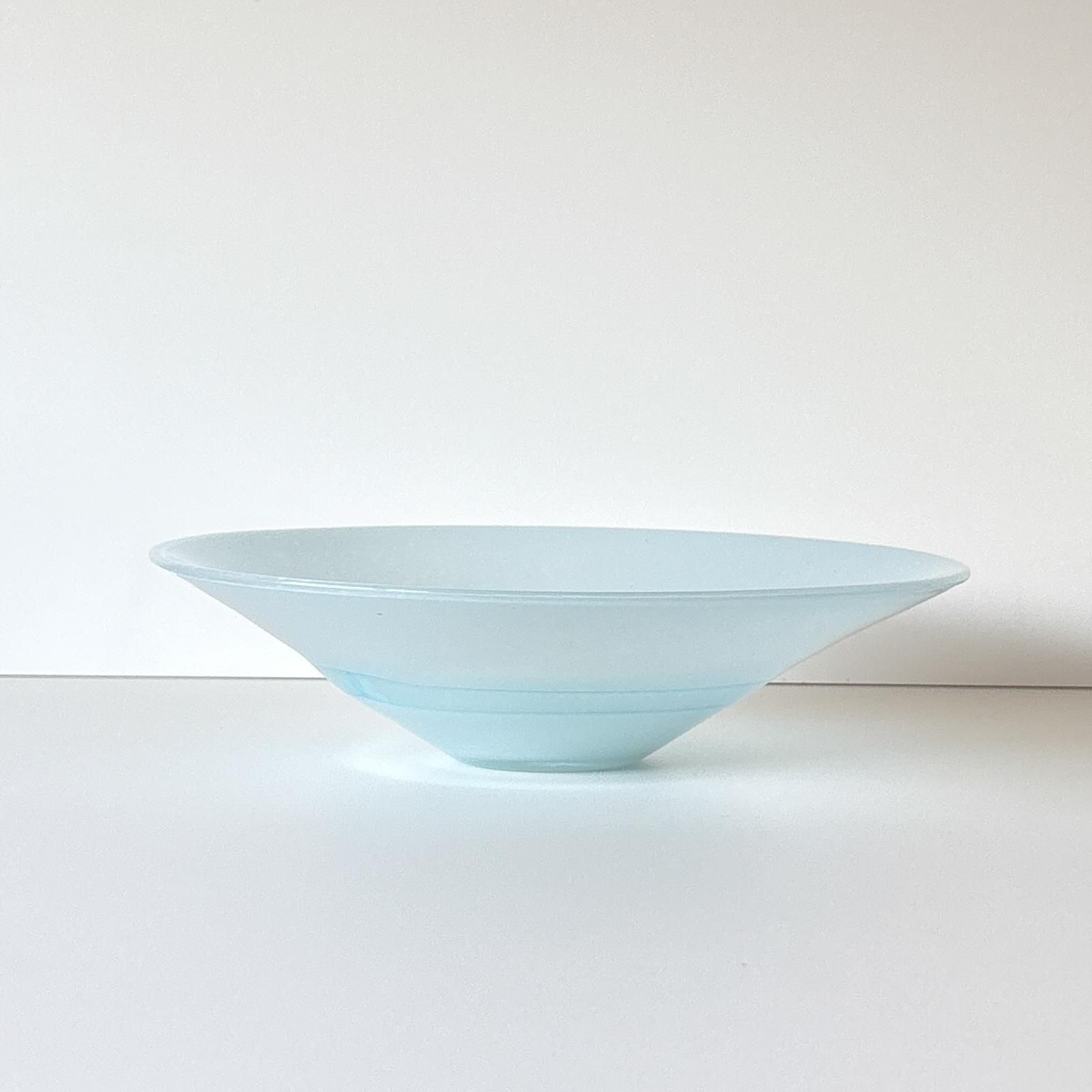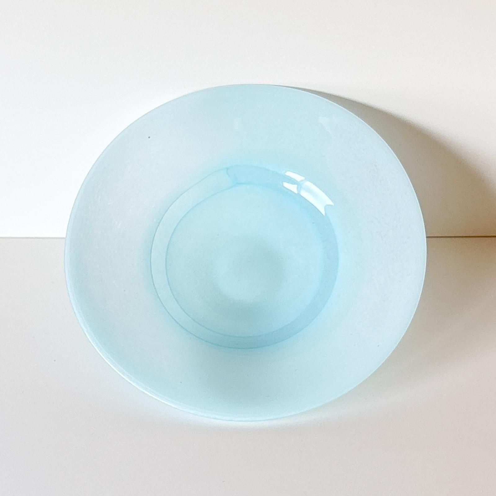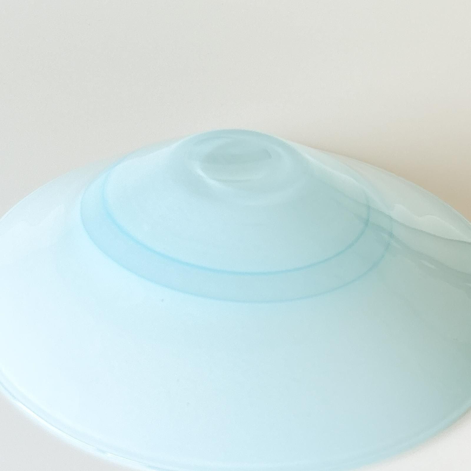 スウェーデンで作られたガラスボウルです。薄い水色がとてもきれいな厚みのあるグラスは、すっと広がった形で、中心に一段薄いトーンのリングをアクセントにしたデザインです。サラダをたっぷりと盛ったり、柑橘やりんごなどのフルーツを入れてキッチンやテーブルに置いておくだけで、すてきな佇まいになります。