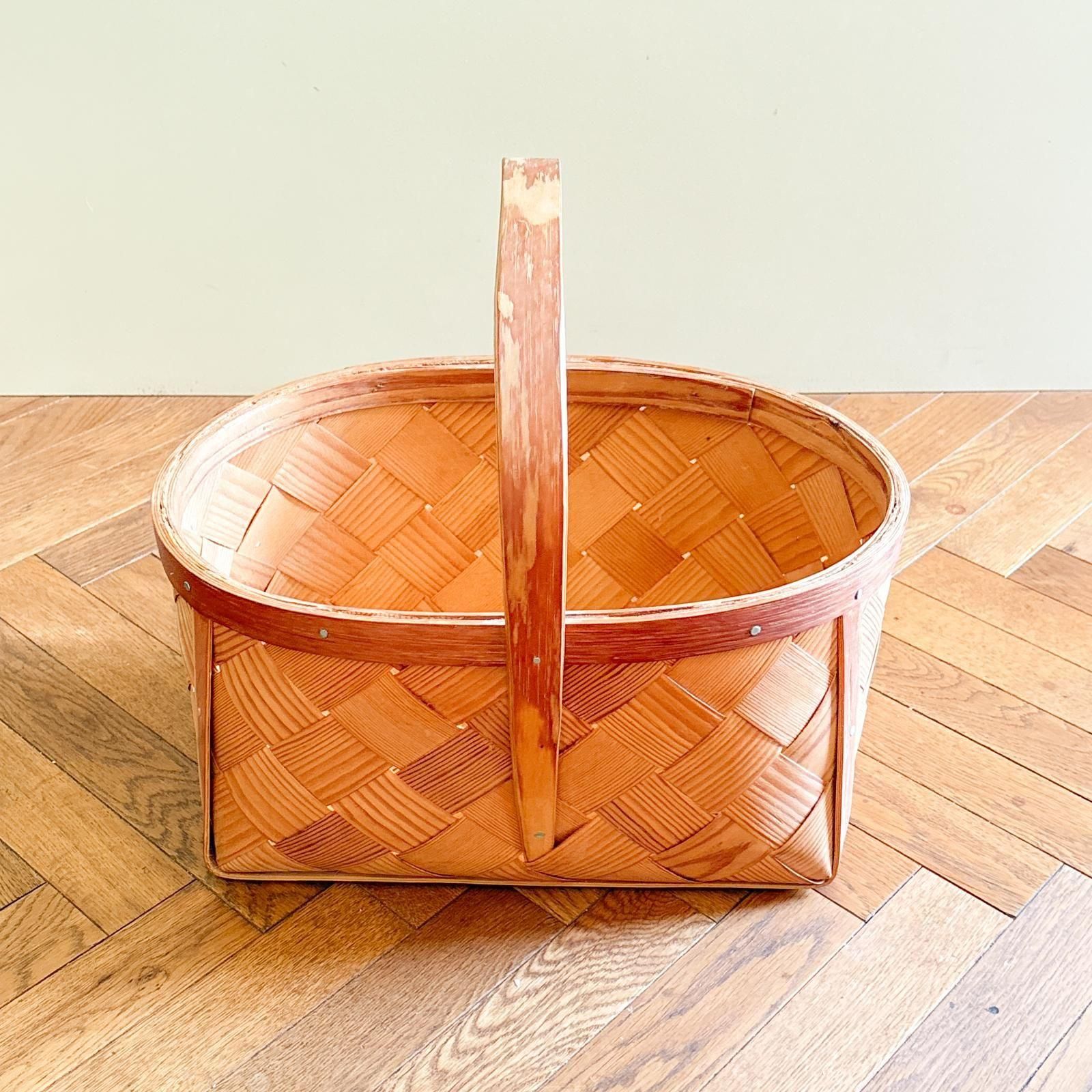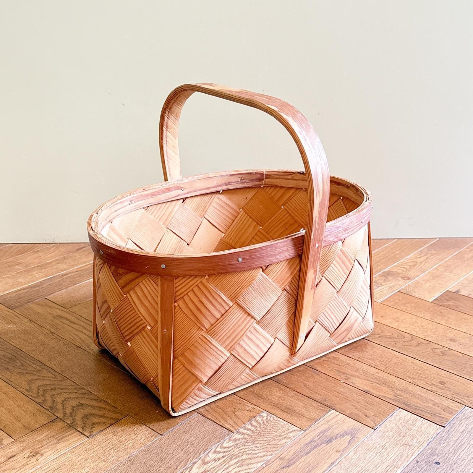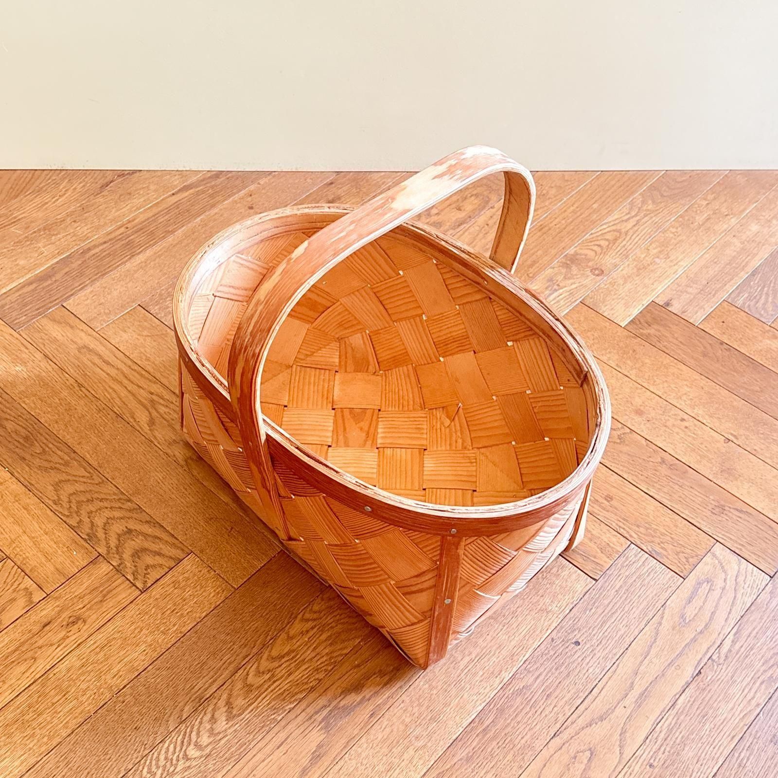 スウェーデン製のハンドル付きバスケットです。木を板状にスライスして編むこの手法は古くからスウェーデンで受け継がれ、「スポーンコリ」の名称で親しまれてきました。ハンドル、本体の曲木の枠組みや編まれた板、どれもとてもしっかりしたつくりです。横幅が40cmある大きなサイズのバスケットは収納力たっぷり。中にものを仕舞って収納として置くと、存在感のあるいいインテリアにもなりますよ。