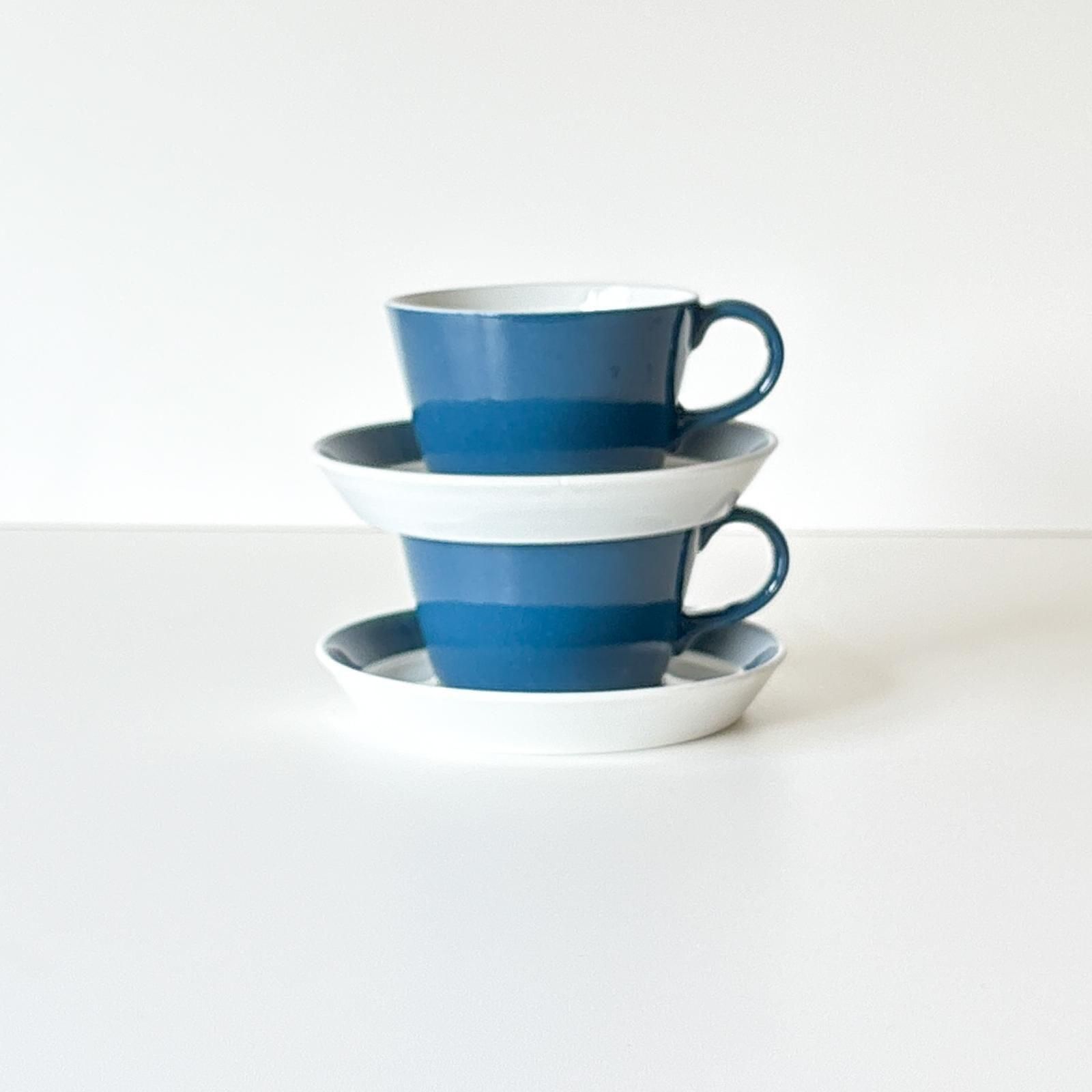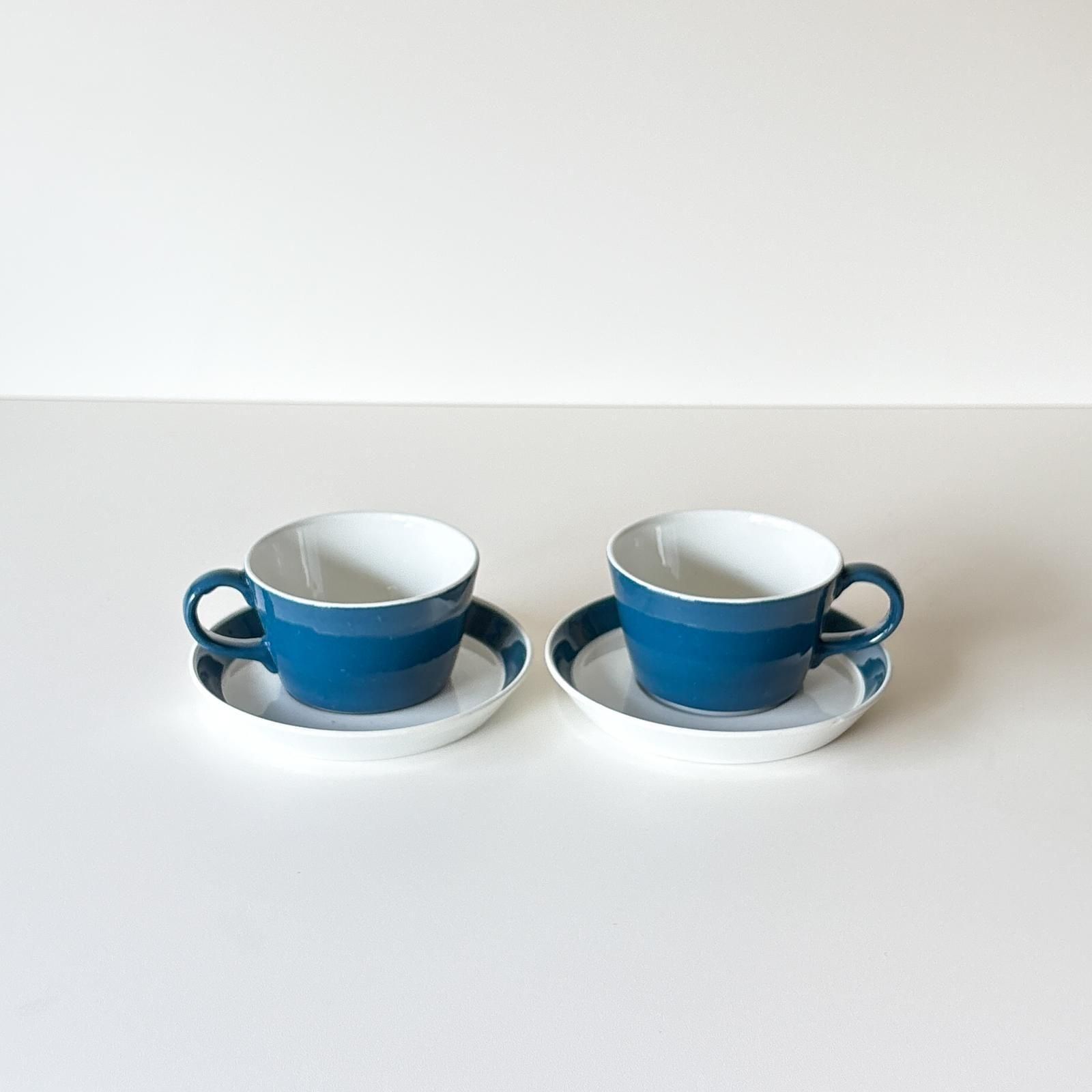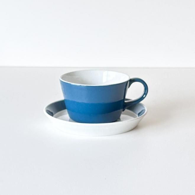 ARABIAで1964年から1974年の間に生産されていたMYRTTI | ミルテッィシリーズのカップ&ソーサーです。フォルムをデザインしたのは、ARABIAでデザインディレクターを務めたカイ・フランクで、彼の元でデザイナーをしていたカーリナ・アホにが装飾を施しました。すっきりしたフォルムと北欧らしい美しいブルーの色合いがとても魅力的な逸品です。