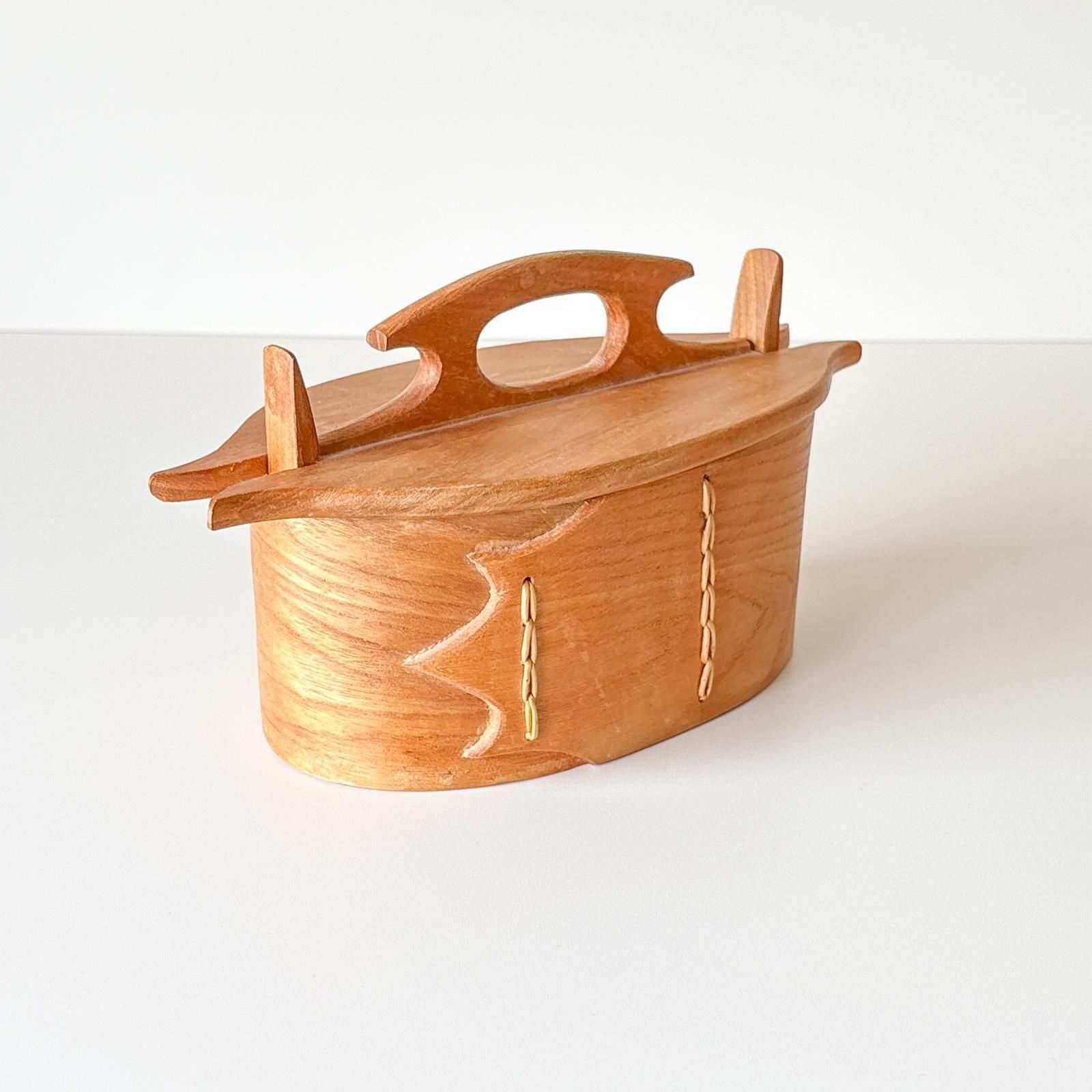 スウェーデンでSVEPASK|スヴェープアスクと呼ばれるの手工芸品です。このデザインはスヴェープアスクの中でも伝統的な形です。曲木の手法でオーバル型をつくり、フタは特徴的なデザインで持ちやすく作られています。留める材料はすべて天然素材を使っていて、釘のかわりには木片を、本体の重ね合わせには白樺の根を裂いたものが使われ、手工芸の魅力がたっぷり詰め込まれた逸品です。裏面には製作年と作者の方の名前が焼き印で入れられています。開閉は5枚目の画像のように、左側のバーを横に傾けてください。