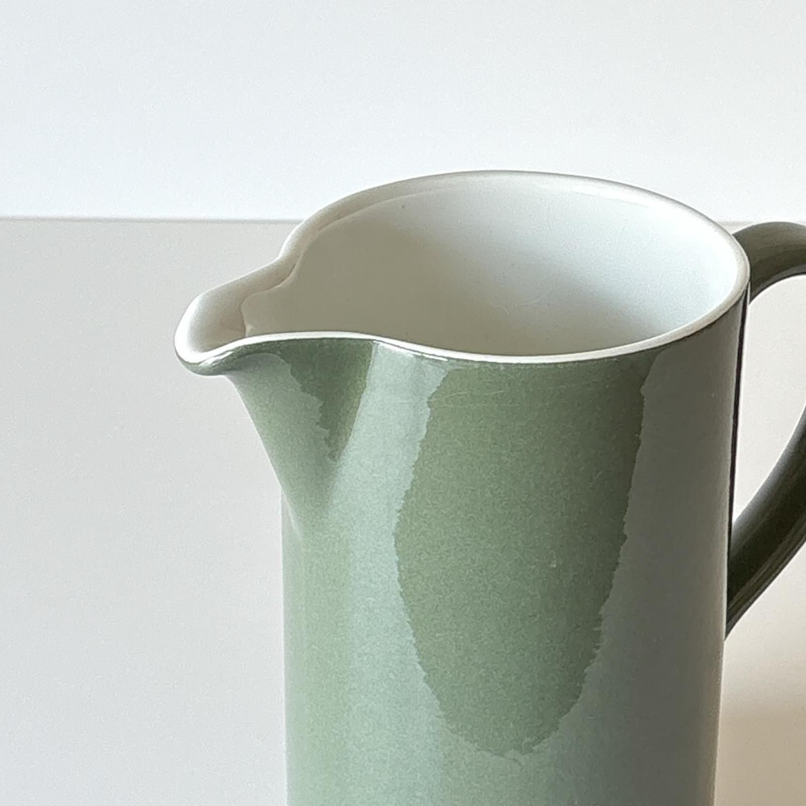 ARABIAで1964年ー1974年の間に生産されていたMYRTTI | ミルッティシリーズのクリーマーです。当時ARABIAでデザインディレクターだったカイ・フランクがモデルをデザインし、彼の元でデザインをしていたKAALINA AHO | カーリナ・アホが装飾デザインをしました。円柱形のすっきりしたフォルムや、北欧らしいきれいなオリーブグリーンの色使いがとても魅力的です。