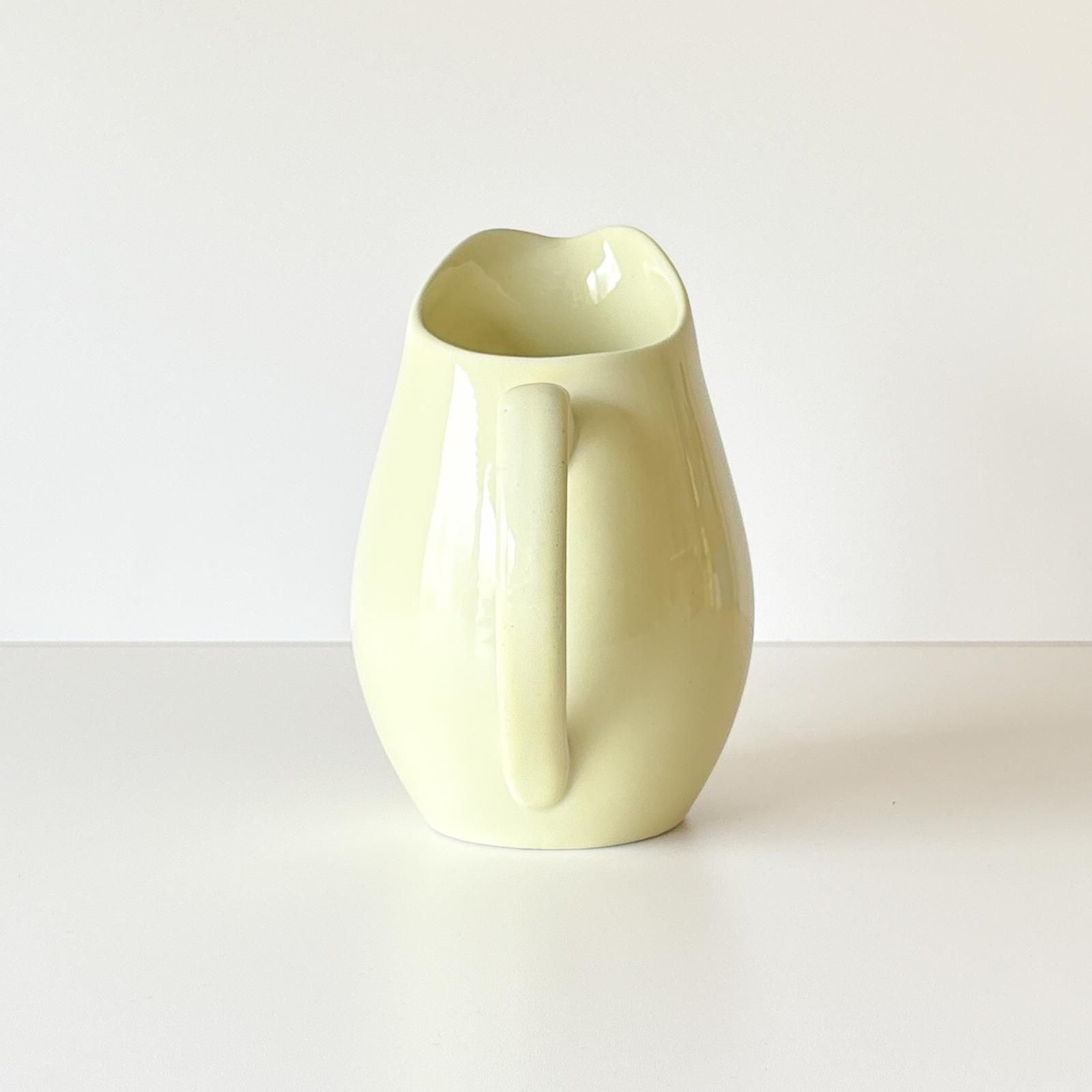 スウェーデンの老舗陶器メーカー・グスタフスベリ製のパステラシリーズのジャグです。デザイナーはスティッグ・リンドベリです。1953年に発表され、その後1962年まで製造されていました。美しい曲線のフォルムとパステルイエローが魅力的なジャグです。そのまま置いておくだけで絵になる存在感がありますが、植物を飾って花器に使うのもすてきです。