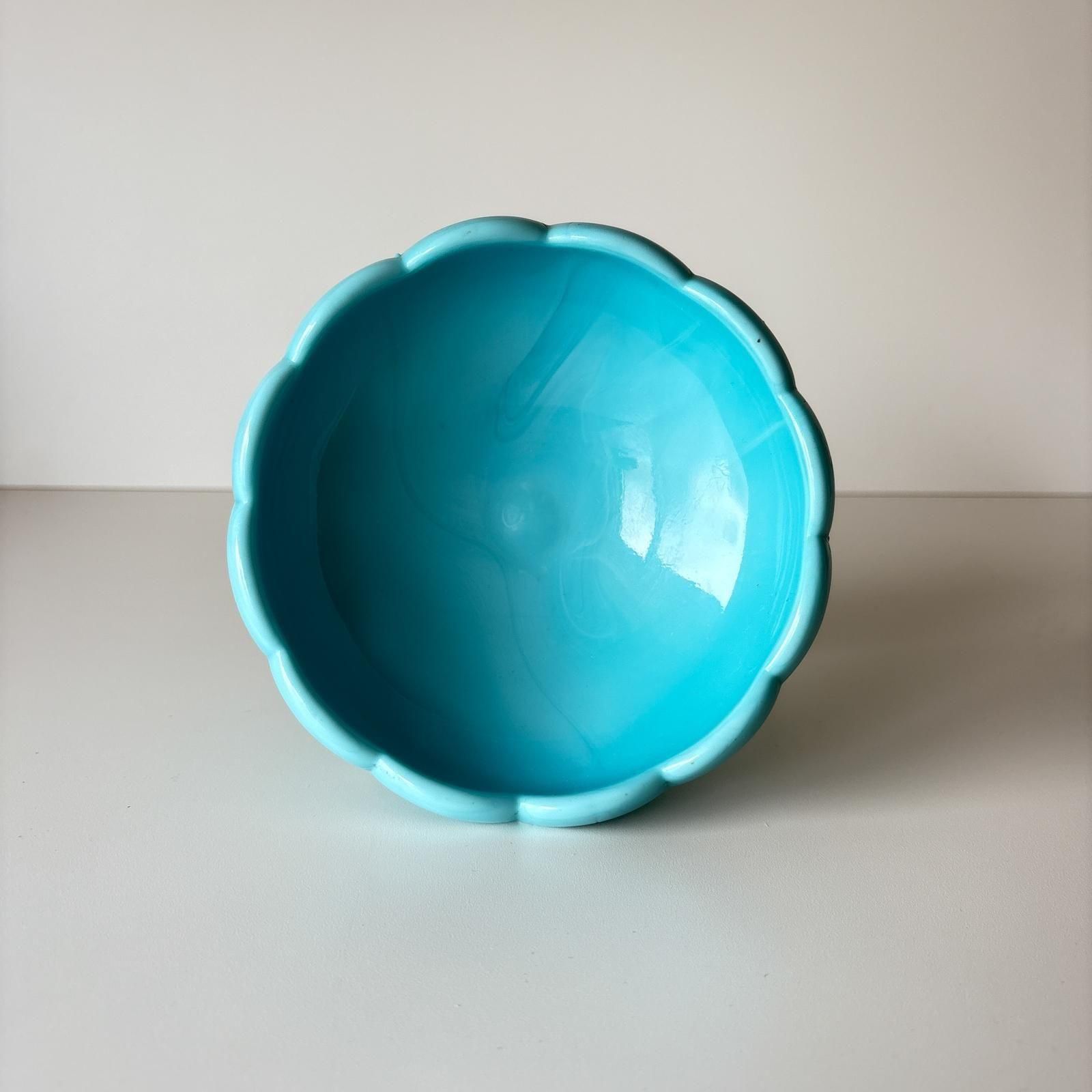 スウェーデン製の脚付きグラスボウルです。美しいターコイズブルーのガラスボウルはエレガントな装飾がほどこされています。イチゴやチェリーなどフルーツを盛り付けて色のコントラストを楽しんだり、お花や植物を生けてフラワーベースとして使うのもおすすめです。