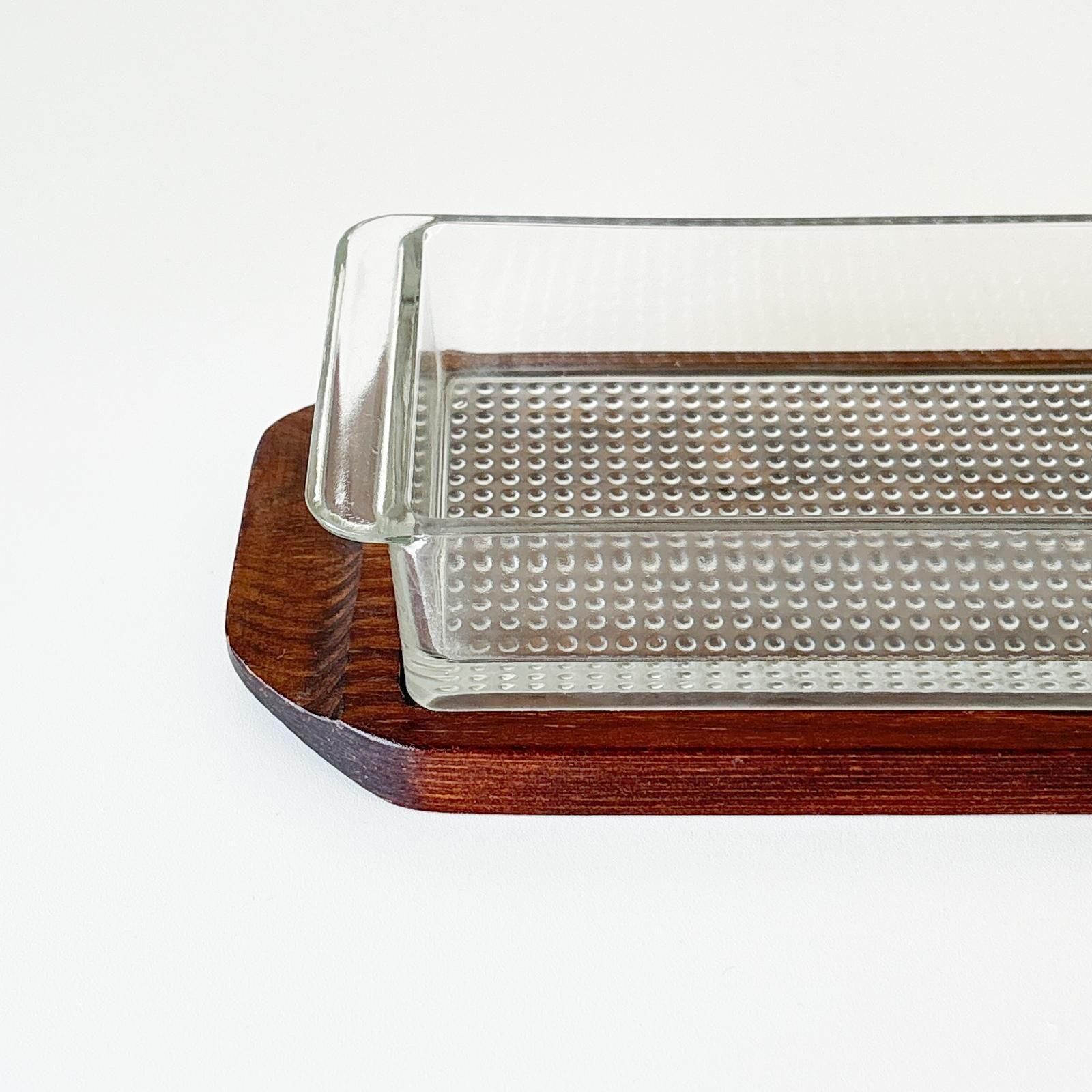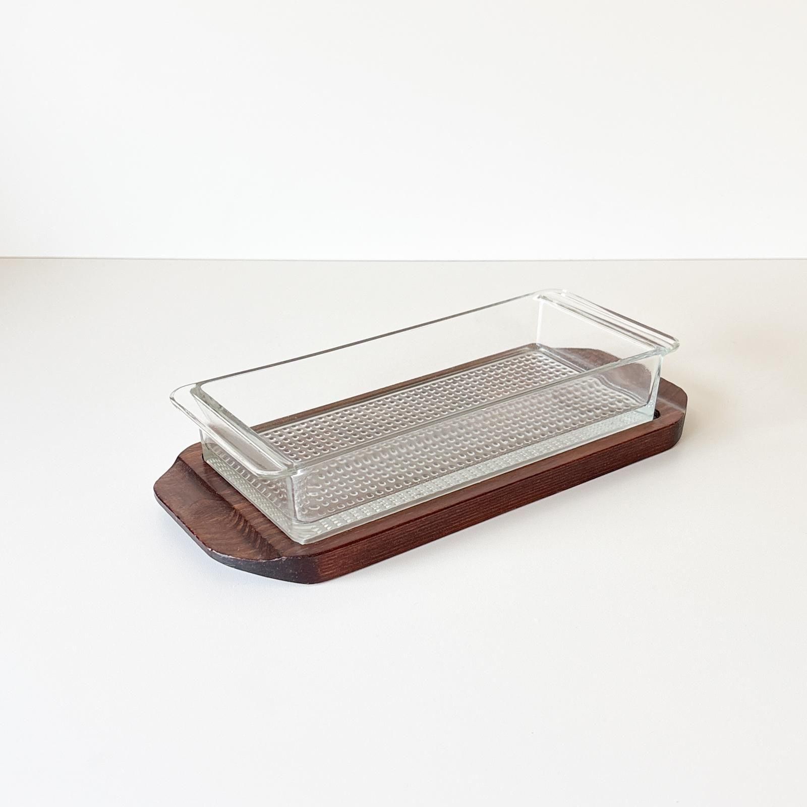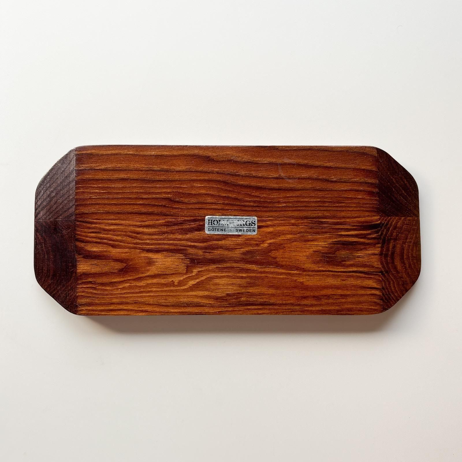 スウェーデンで1960年代に製造されていたグラスとトレーを組合わせたサービングセットです。厚みのある長方形のグラスは両サイドに持ち手があり、底面の外側は丸い凸が並び、ドット模様になっています。ローズウッド材のトレーにピタリとはまるように作られています。トレーの両サイドは持ちやすいように、裏に角度がつけられています。