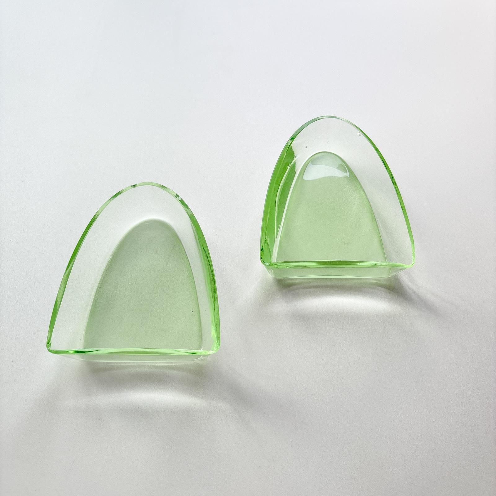 スウェーデンで1960年代に製造されていたグラスとトレーを組合わせたサービングセットです。ペールグリーンが美しいガラスボウルをふたつセットするとオーバル型になります。トレーはガラスがピタリとはまるように作られていて、トレーが持ちやすいように裏のフチに角度がつけられています。
