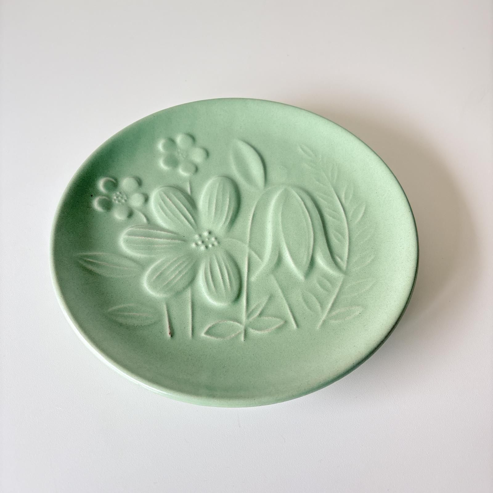 スウェーデンのウプサラ・エクビー社で作られていたミントグリーンが美しいプレートです。デザイナーはアンナ・リサ・トムソン女史。彼女がデザインする植物柄や独自の色使いはとても魅力的で、現在でもコレクターがいるほど人気があります。厚みのあるテラコッタ生地に植物柄を立体的に表現し、表と裏にミントグリーンの釉薬をかけて仕上げています。植物の魅力を上手に捉え、やわらかな質感に仕上げたやさしい風合いのプレートです。