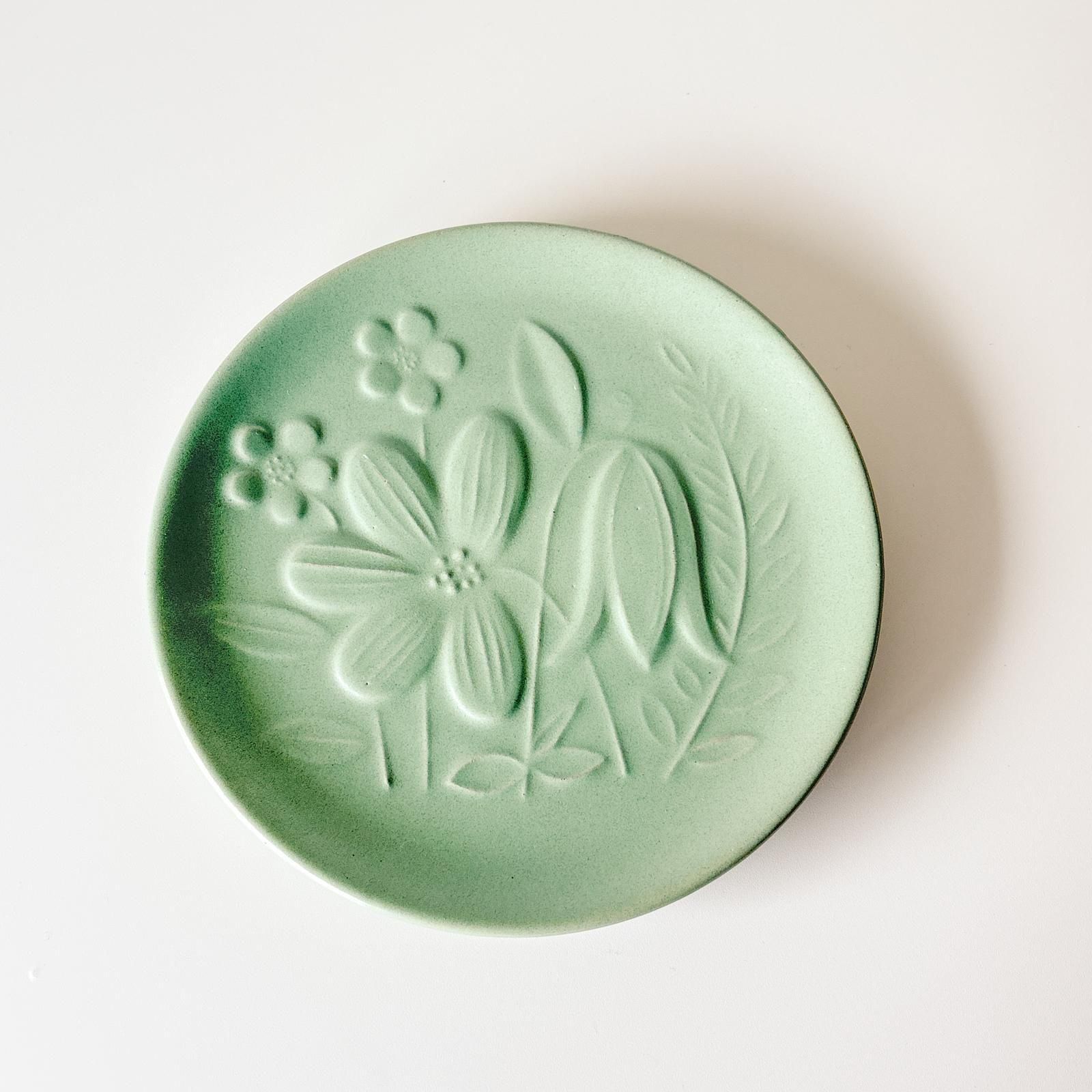 スウェーデンのウプサラ・エクビー社で作られていたミントグリーンが美しいプレートです。デザイナーはアンナ・リサ・トムソン女史。彼女がデザインする植物柄や独自の色使いはとても魅力的で、現在でもコレクターがいるほど人気があります。厚みのあるテラコッタ生地に植物柄を立体的に表現し、表と裏にミントグリーンの釉薬をかけて仕上げています。植物の魅力を上手に捉え、やわらかな質感に仕上げたやさしい風合いのプレートです。
