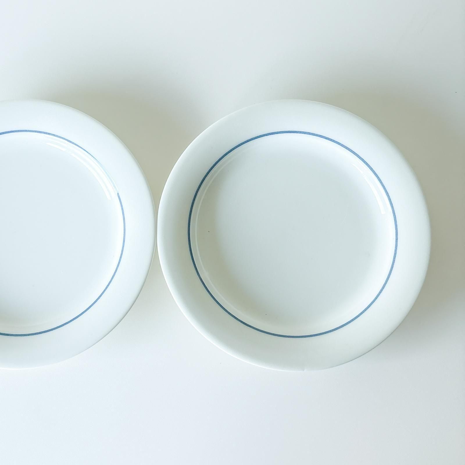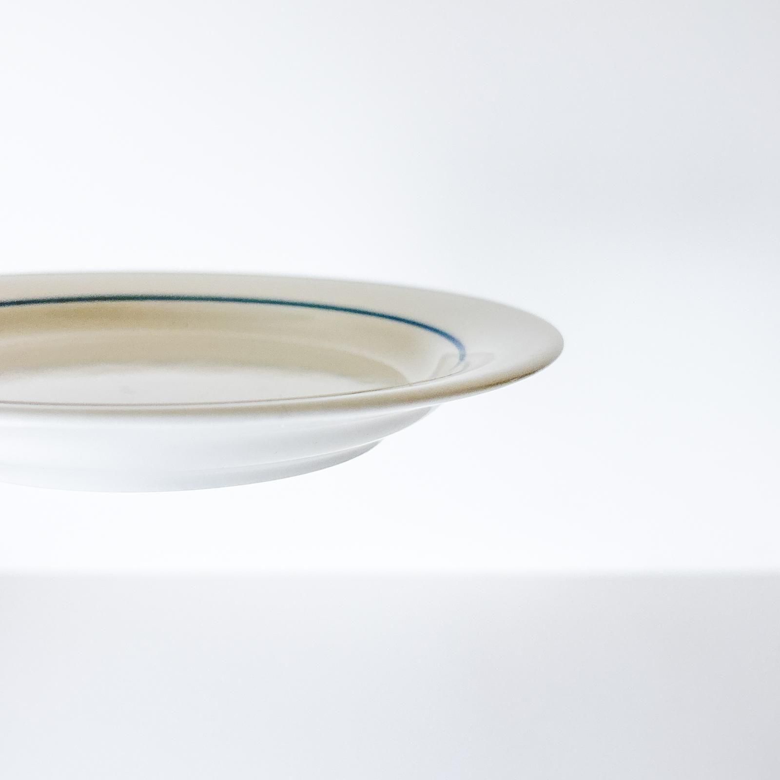 フィンランド・ARABIA社でインケリ・レイヴォがデザインした、ARCTICA | アークティカモデルのプレートです。今回は珍しくブルーのライン入りを見つけました。17cm弱の小さめのプレートは、ディナープレートの横にパンをのせてつかったり、サイドプレートとしてお使いいただけます。