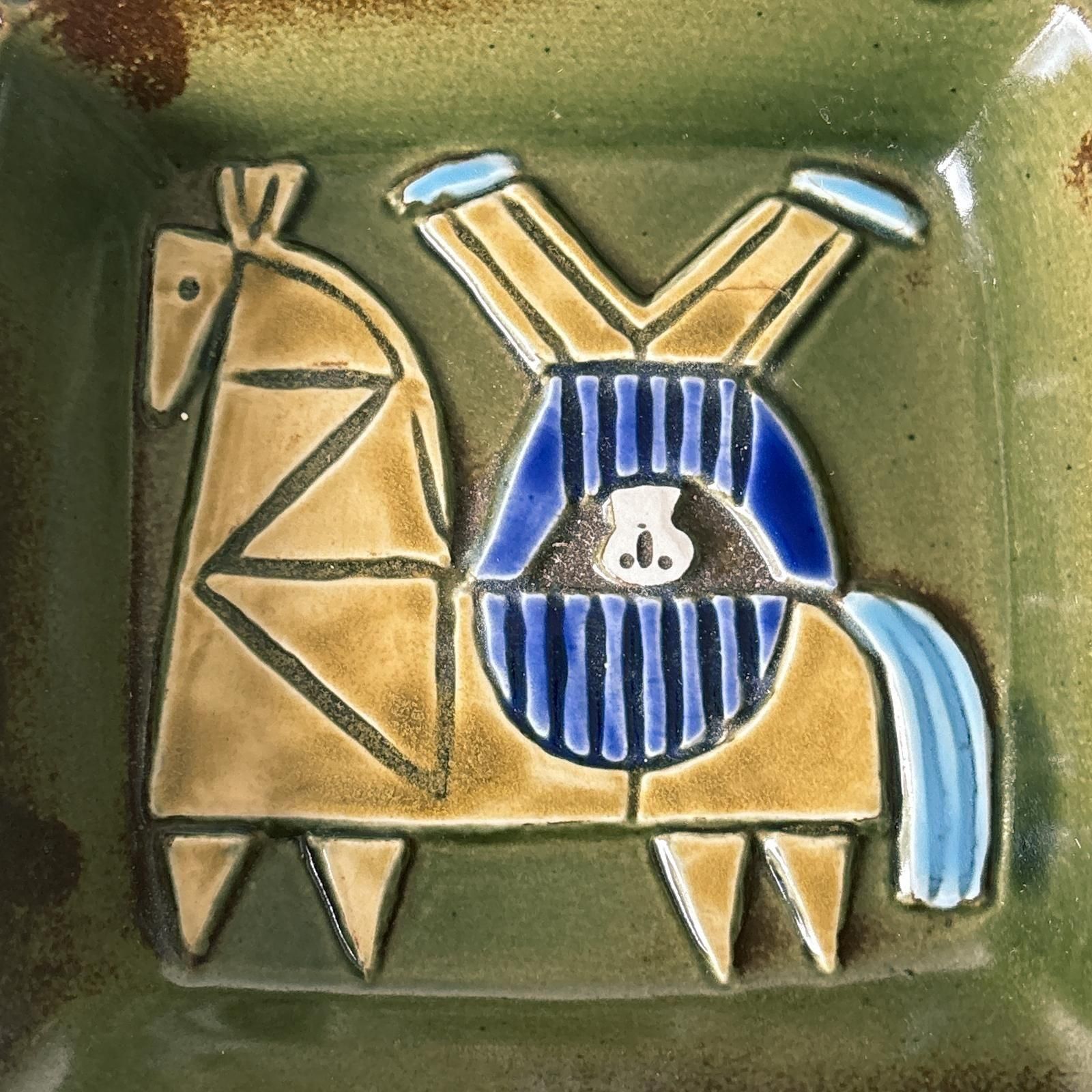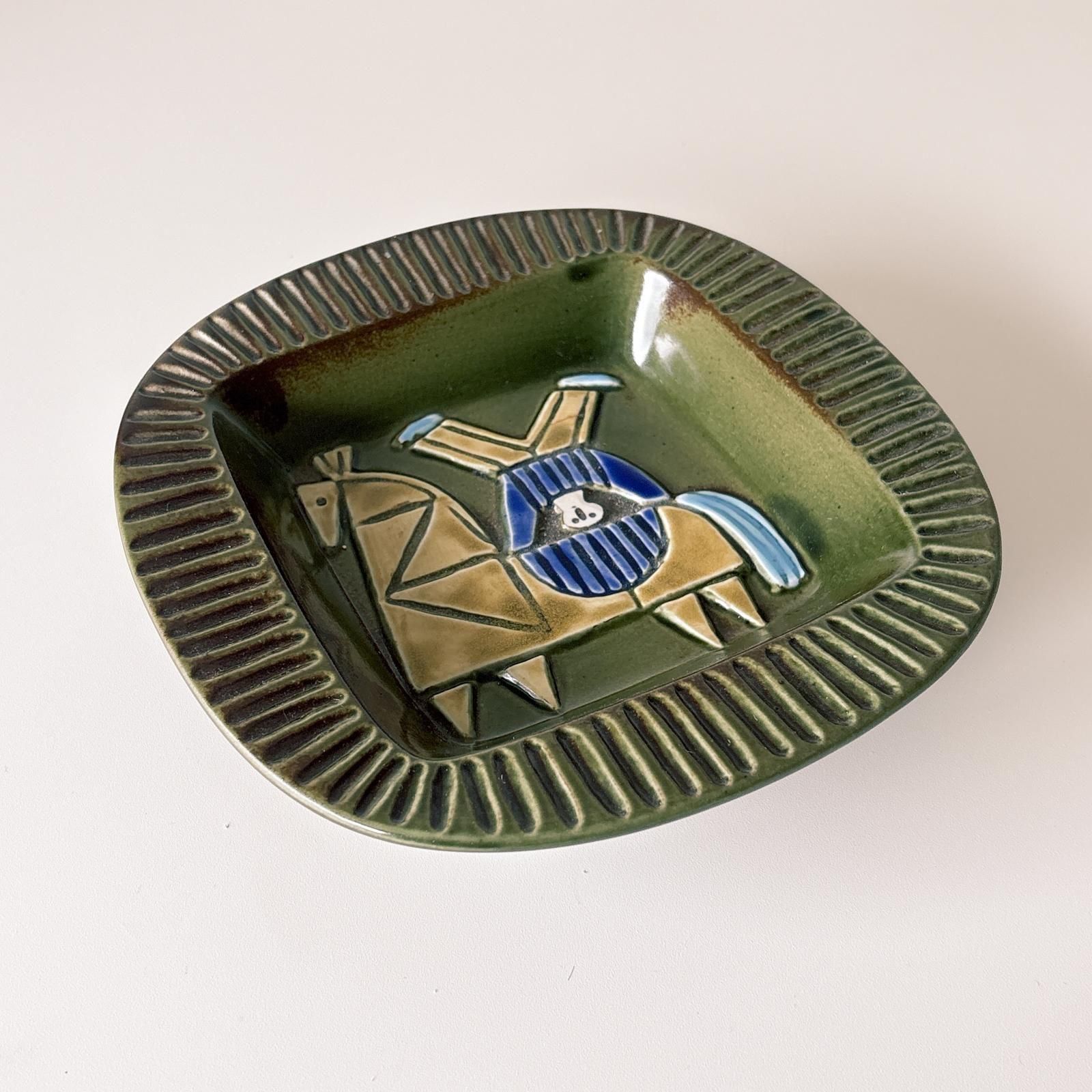 リサ・ラーソンが陶器メーカー・グスタフスベリでデザインし、1960年〜1970年の間に製造されていた、HARLEKINシリーズのスクエアプレートはずっしりと重みがあります。馬とその上で逆立ちをする少年の姿がユニークで、リサらしいデザインを感じます。そのまま置いておくだけで絵になる存在感があります。