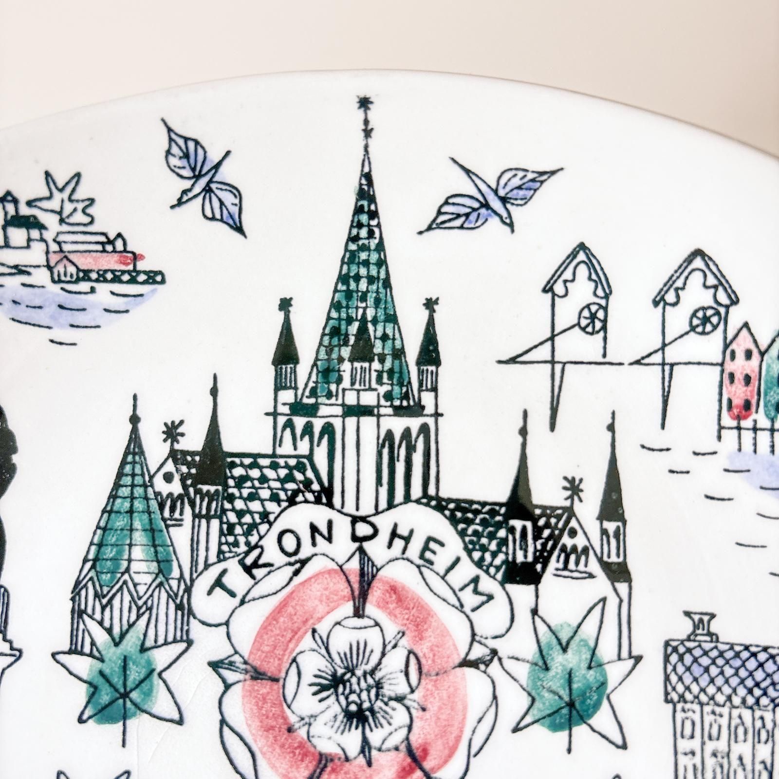 ノルウェーの陶器メーカー、スタヴァルゲンフリントのデコレーションプレートは壁に掛けられます。デザインはIngel Waage | インゲル・ヴォーゲが手掛けました。ノルウェーのトロンハイムの街並みが描かれ、大聖堂や海辺、街を行き交う人々がカラフルに描かれています。中心にはバラが描かれたかわいらしい絵柄です。