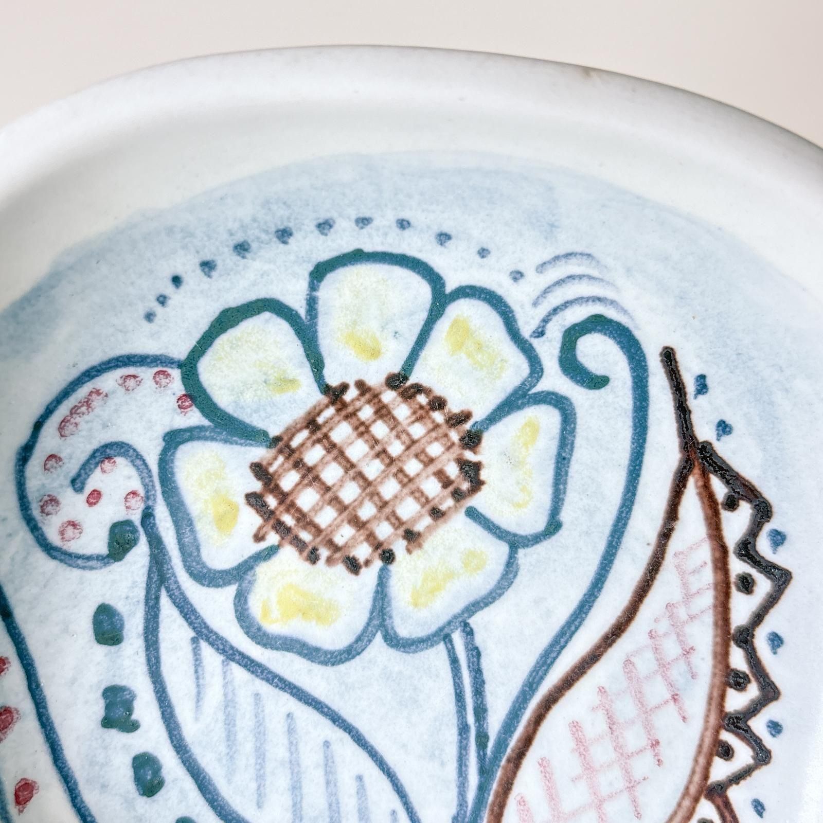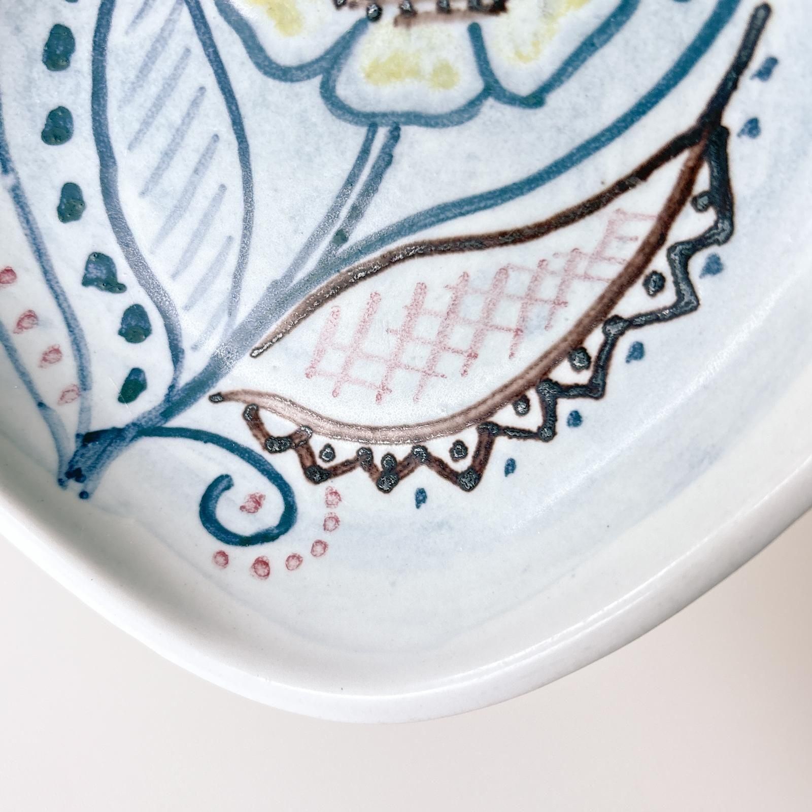 スウェーデン・ロルストランド製のデコレーションプレートです。しっかりと厚みのある14cmの角が丸いプレートに、手描きで植物モチーフが描かれています。色使いや細かな模様に独自性があって、個性的な絵皿に仕上がっています。バックスタンプも手描きでRと王冠3つが入れられています。存在感があるのでそのまま飾ったり、アクセサリーなどのトレーとして使うのもおすすめです。