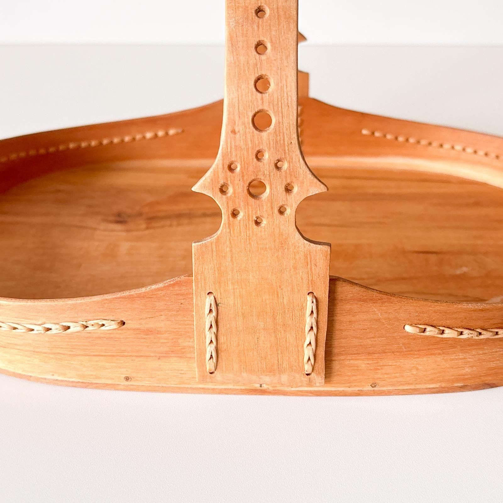スウェーデンで見つけた曲げ木の手法で手作りされたハンドル付きトレーです。本体の両サイドは山なりにカーブしていて、ハンドルにも模様が入れられた凝ったデザインです。曲げ木を重ねて留めているのは白樺の根を割いたもので、トレーのフチも根を使って一周に渡って編み込まれています。その編み込まれた箇所がいいアクセントになっていて、細部にまでこだわりが感じられる手工芸作品です。裏面には作者のイニシャルと制作年が刻印されています。