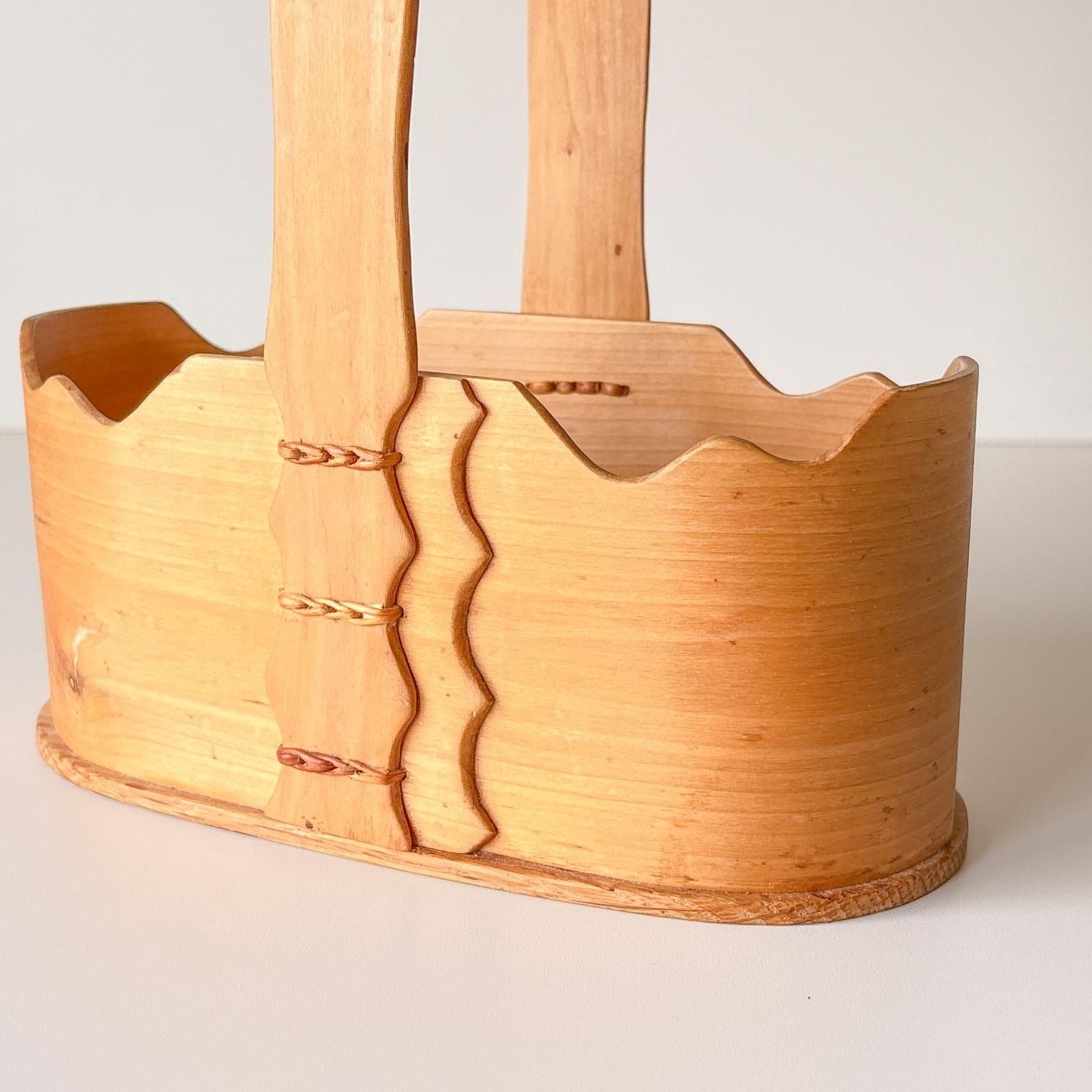 スウェーデンで見つけた曲げ木の手法で手作りされたハンドル付きのオーバルボックスです。本体のフチはカーブを付け、曲げ木を重ねて留めているのは白樺の根を割いたものです。その編み込まれた箇所がいいアクセントになっていて、細部にまでこだわりが感じられる手工芸作品です。裏面には作者の名前と制作年が刻印されています。