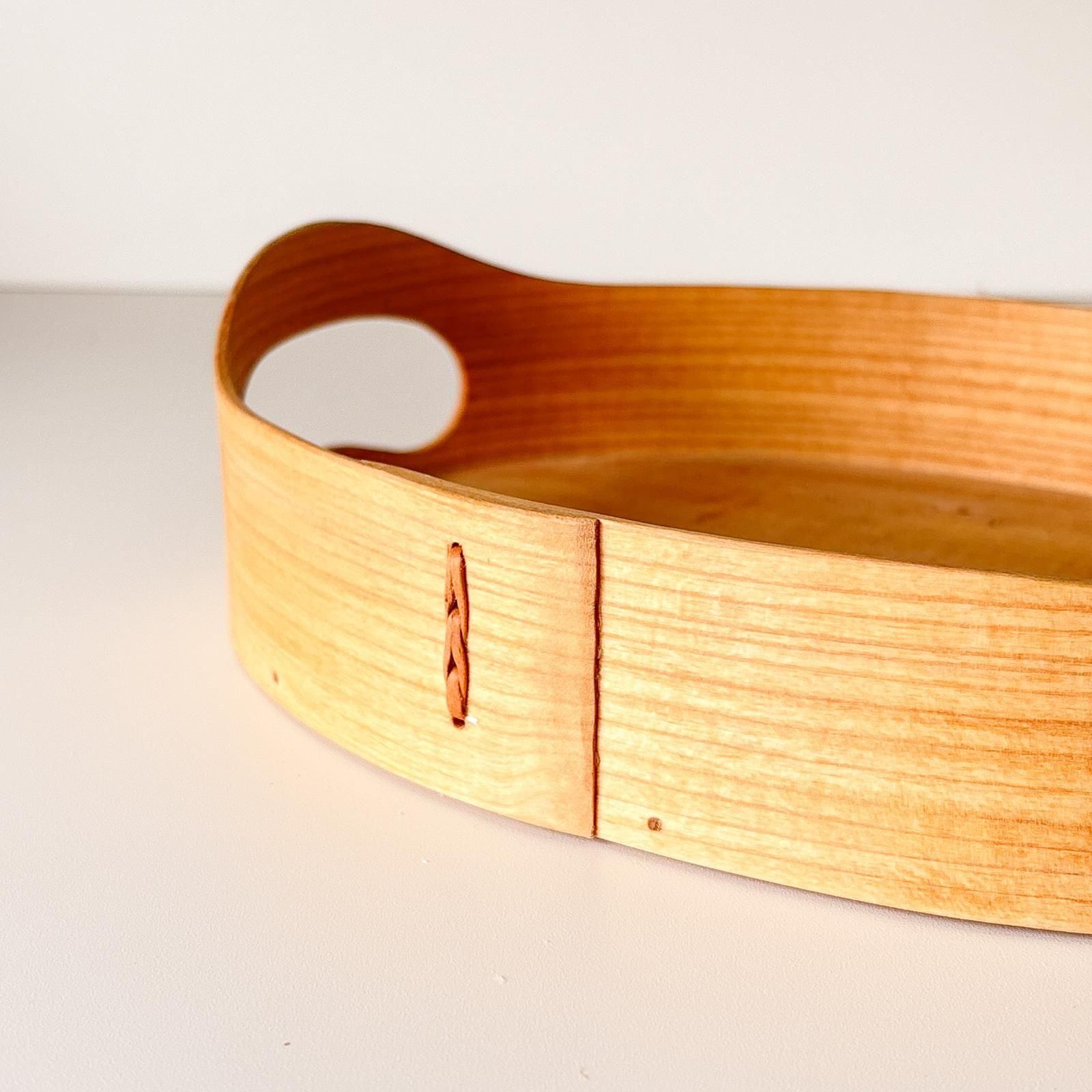 スウェーデンで見つけたハンドメイドのトレーです。曲げ木の手法で重ね合わせ、白樺の根を割いた素材で留められています。その編み込まれた箇所がいいアクセントになっています。シンプルなつくりで持ってみると軽くて使いやすそうです。裏面には製作者のイニシャルが彫られています。