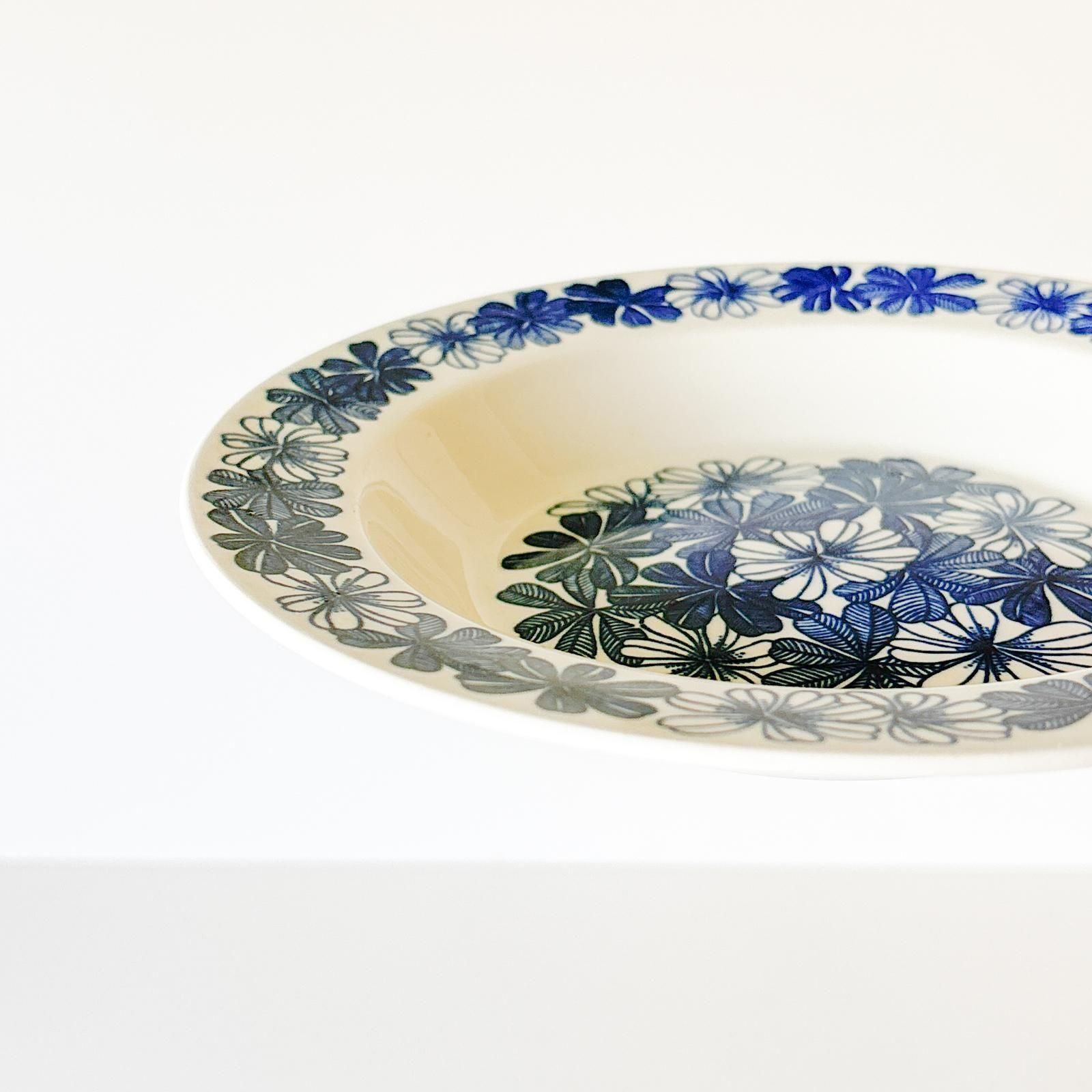 ARABIAで1970年代に作られていた、ブルーフラワーが印象的なスーププレートです。デザインをしたのはESTERI TOMURA|エステリ・トムラ女史で、植物をデザインモチーフにすることが多い彼女の独自のタッチと色合い、どちらも魅力的です。