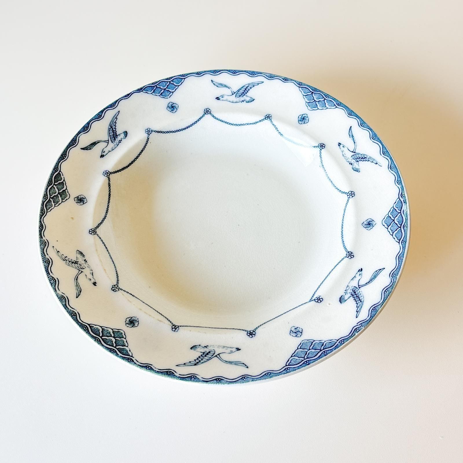 グスタフスベリで1913年から1941年の間に生産されていたORESUND|オレスンドシリーズのスーププレートです。オレスンドは南スウェーデンのマルメとコペンハーゲンの間の海峡に名称で、その海峡でよく見られるカモメをモチーフにして、プレートをぐるりと囲んでいます。ちょっと悪い顔をしたカモメの表情がユニークなデザインです。