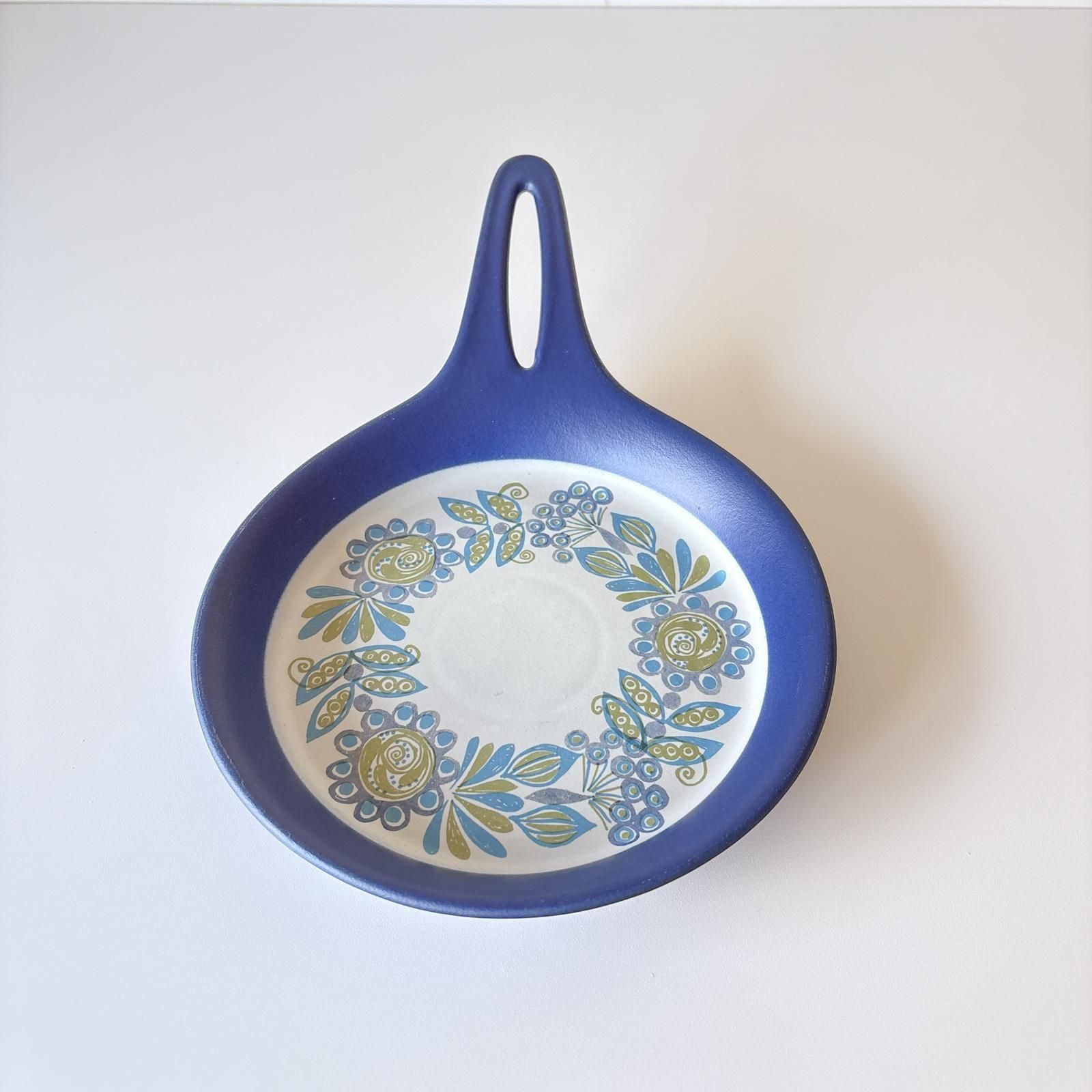 ノルウェーの陶器メーカー・FIGGJO製の陶器製スキレットです。プレートにはブルーのグラデーションとグリーンで描かれた植物と鮮やかなネイビーが印象的なヴィンテージアイテムです。スキレットとして使う他、ハンドル付きのプレートとして日常使いするのもおすすめです。