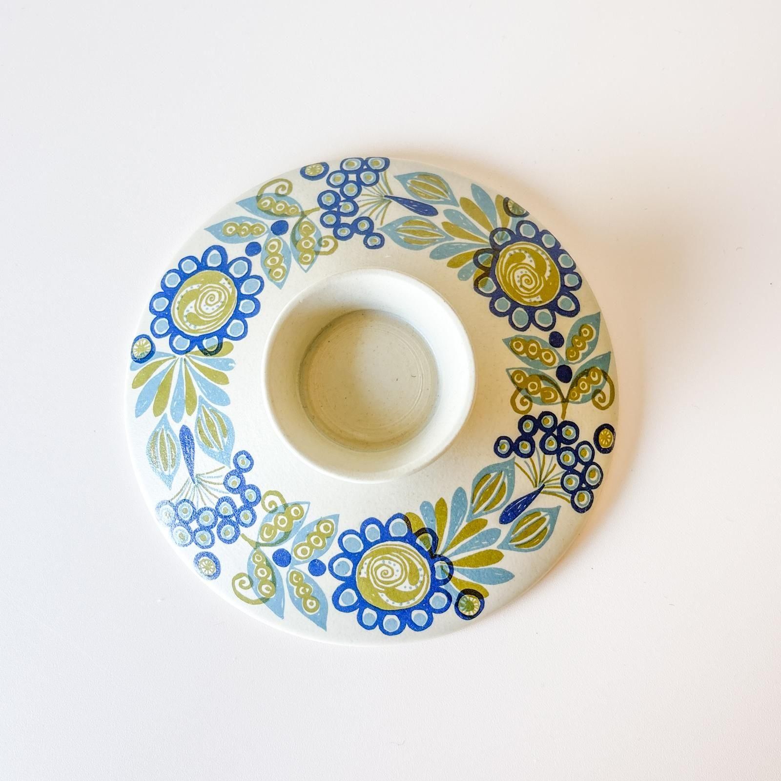 ノルウェーの陶器メーカー・FIGGJOの陶器製キャセロールです。フタにはブルーのグラデーションとグリーンで植物が描かれ、本体の鮮やかなネイビーが印象的なヴィンテージアイテムです。