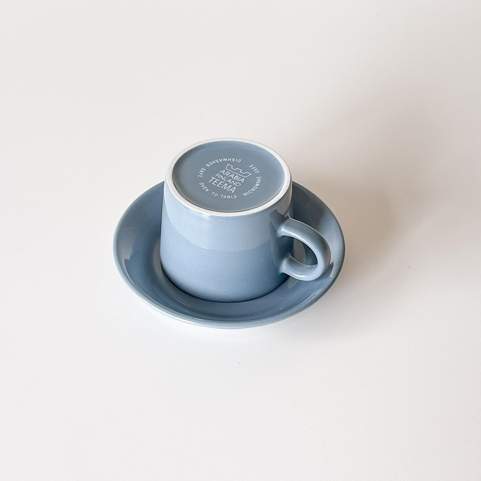 ARABIA社のアイコン的な存在のTEEMAシリーズのヴィンテージで王冠ロゴのカップ&ソーサーSサイズです。ブルーグレイの絶妙なニュアンスの色合いがとても魅力的。ソーサーの表面は溝がなくフラットなのでプレートとして単独使いができるのも、このカップ&ソーサーのすばらしさです。