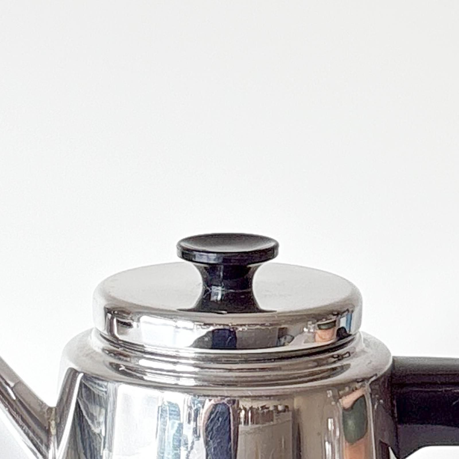 フィンランド・AMIGO|アミーゴ社のコーヒーポットです。容量は1.5リットル。1970年代に生産されていました。安定感のある台形の本体、本体と水平に付けられたL字型のハンドルとフタの持ち手にはブラックの樹脂が合わせられ、そのデザイン性の高さに魅力を感じます。