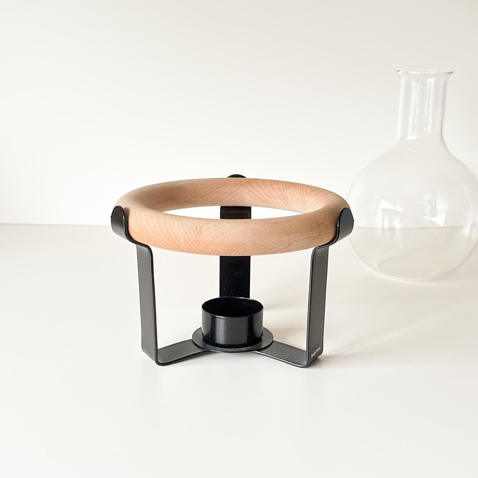 フラスコ型のポットの持ち手とウォーマーには木が用いられ、見た目にもあたたかみを感じるデザインに仕上げられています。持ち手の木はゴムで止められ取り外しが可能で、二本の黒いゴムを外すとふたつに別れ、ウォーマーの木製リングも外れます。