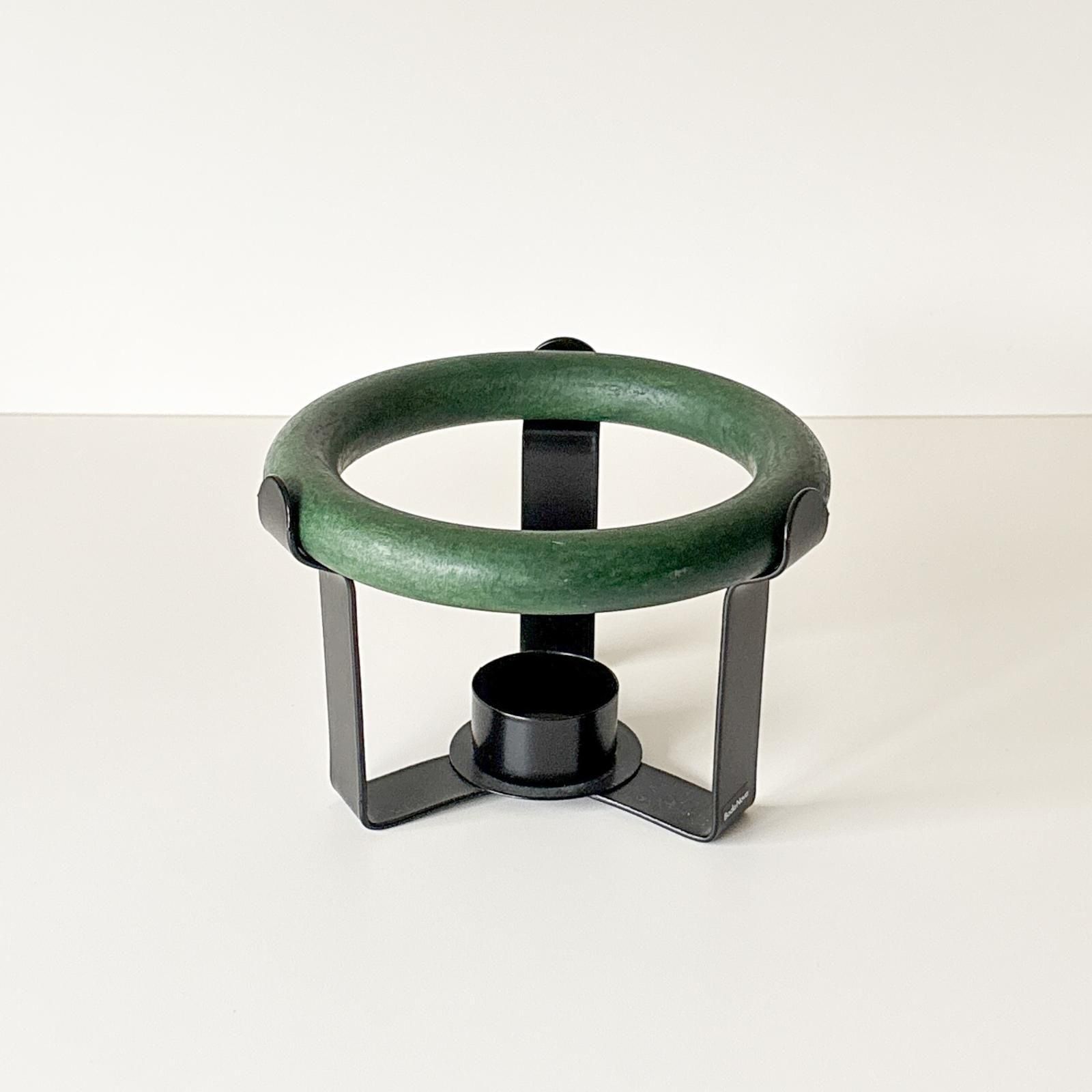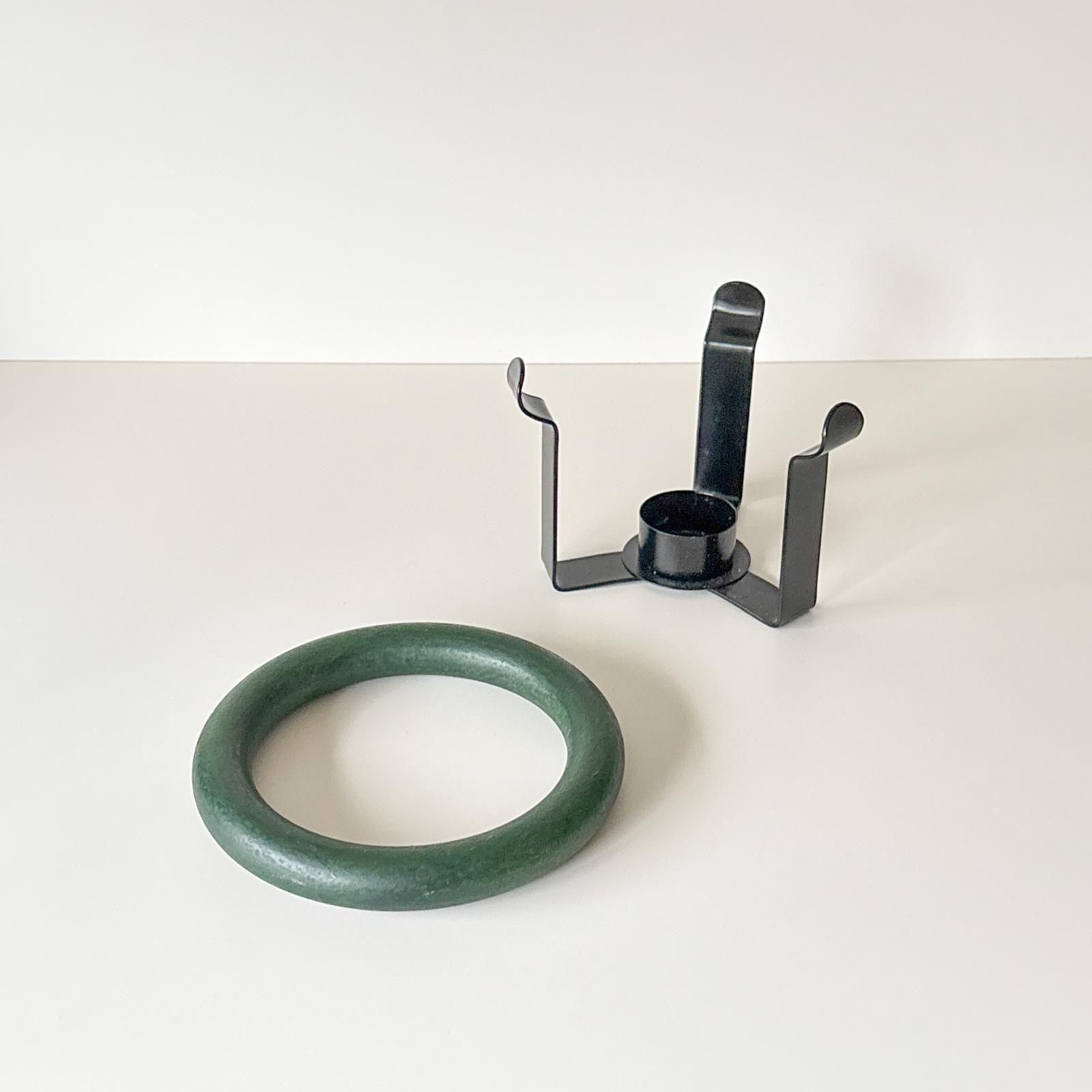 フラスコ型のポットの持ち手とウォーマーの木製リングはモスグリーンに塗装され、見た目にもあたたかみを感じるデザインに仕上げられています。持ち手の木は取り外しが可能で、二本の黒いゴムを外すとふたつに別れ、ウォーマーのリングも外れます。