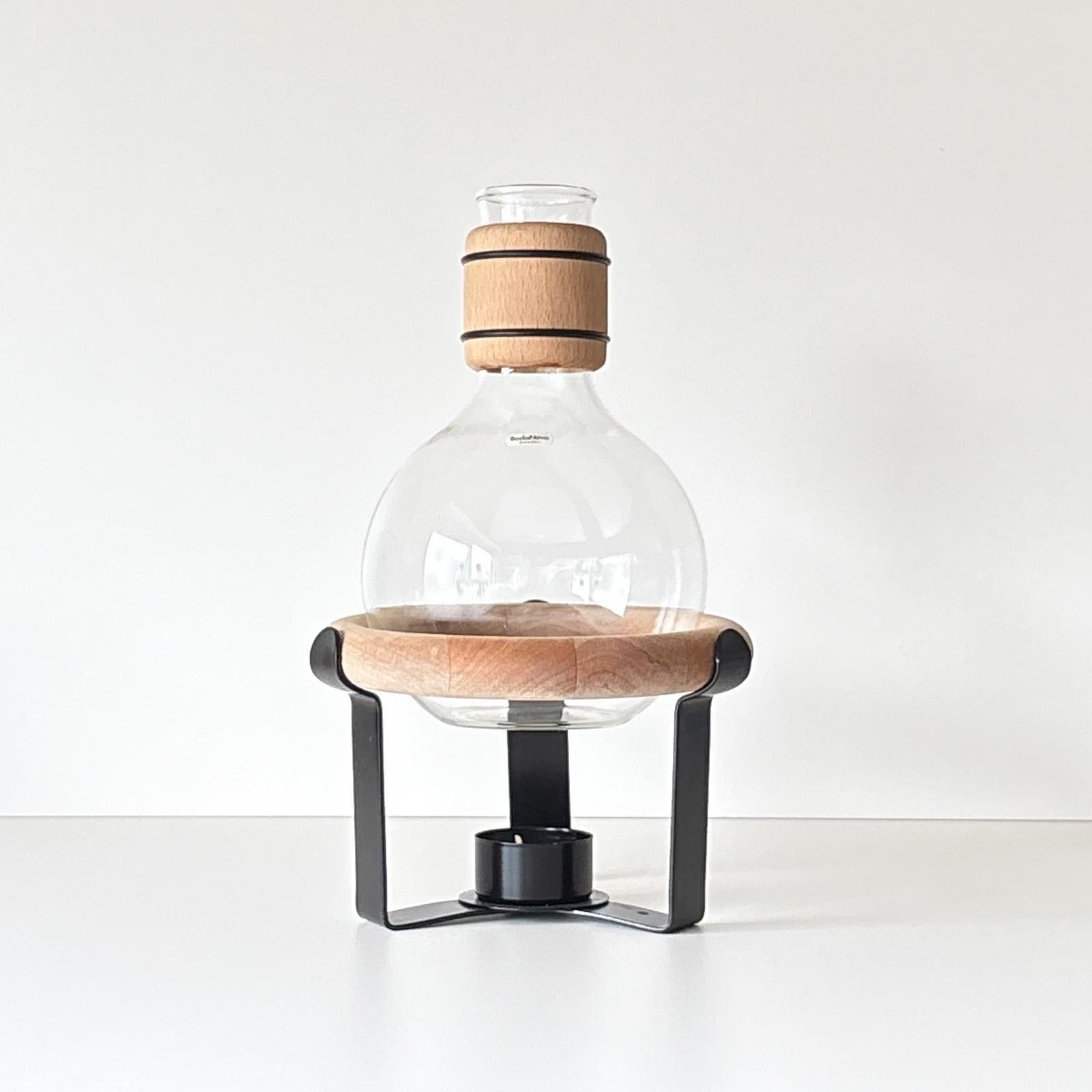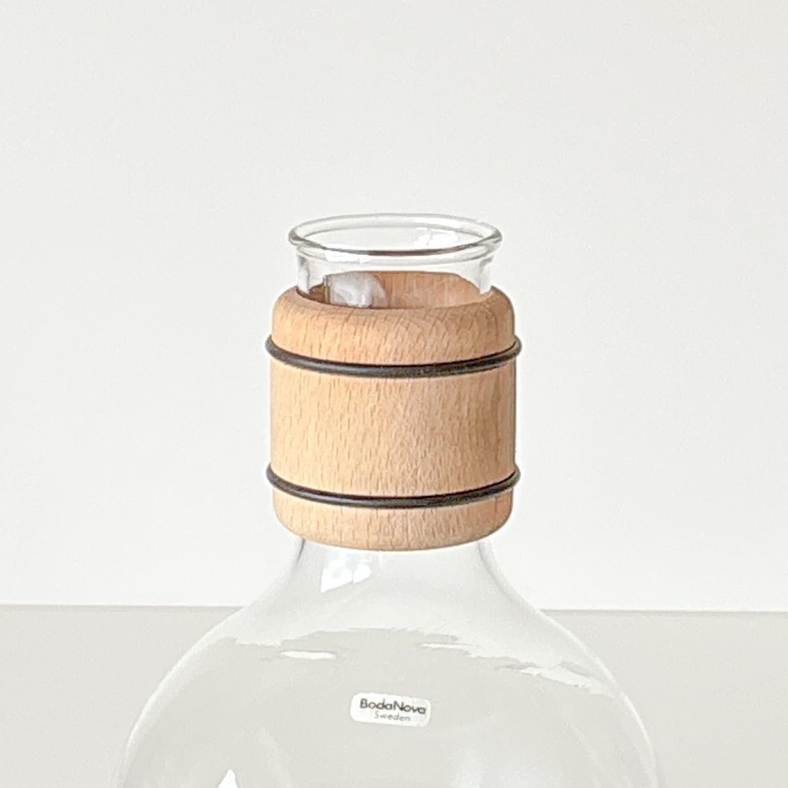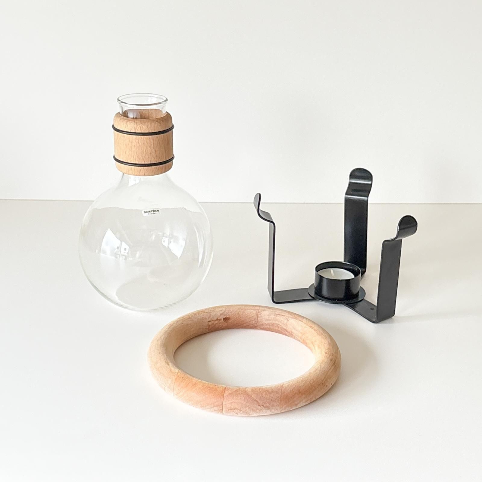 フラスコ型のポットの持ち手とウォーマーには木が用いられ、見た目にもあたたかみを感じるデザインに仕上げられています。持ち手の木は取り外しが可能で、二本の黒いゴムを外すとふたつに別れ、ウォーマーの木製リングも外れます。