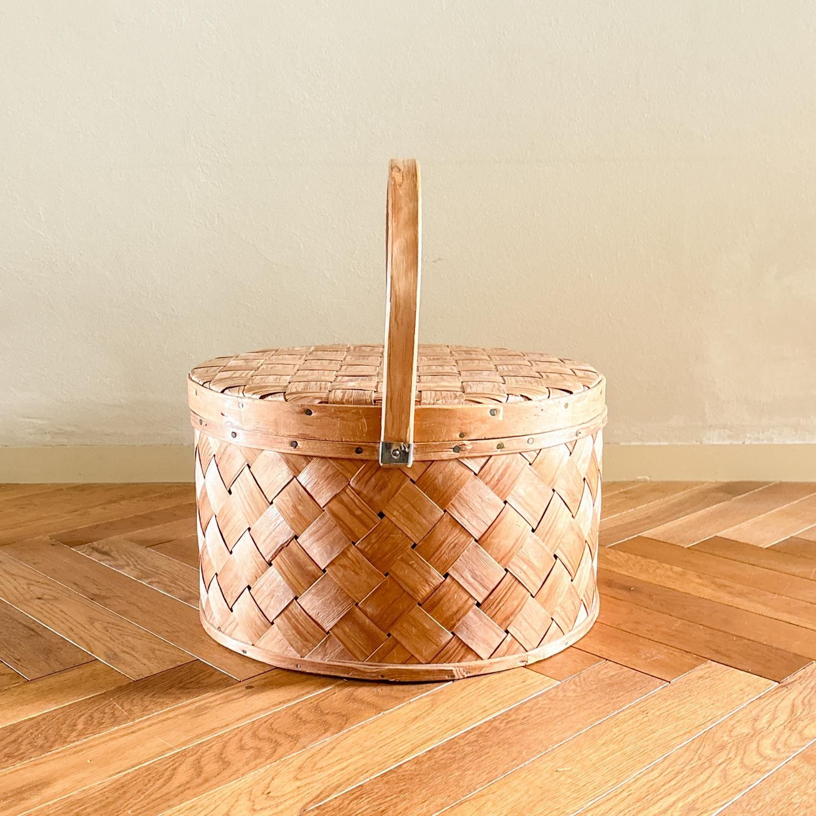 スウェーデン製のヴィンテージバスケットです。スウェーデンでは「スポーンコリ」と呼ばれ、昔から収納カゴとして親しまれてきました。底面にはスポーンコリの産地であるVÅMHUSのスタンプが入っています。スポーンコリは長方形が多い中、レアアイテムであるハンドル付きの丸型を見つけました!フタ付きのカゴは収納力たっぷり。見せる収納としてこの雰囲気のあるバスケットを部屋に置くと、存在感のあるいいインテリアになりますよ。コンディション良好なので丸型を探されていた方はこの機会にぜひ!