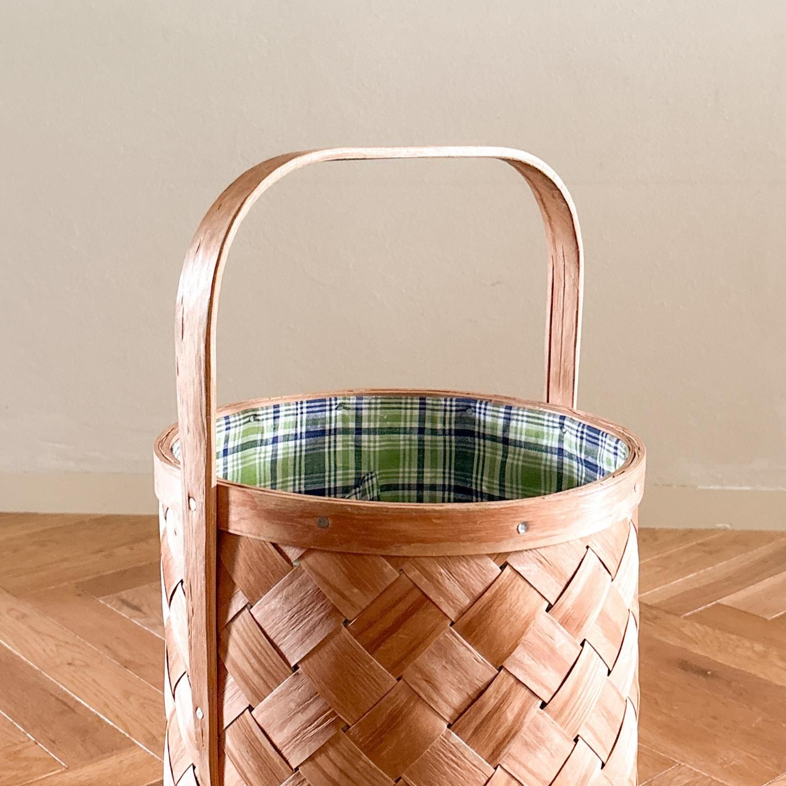 スウェーデン製のハンドル付きバスケットです。木を板状にスライスして編むこの手法は、古くからスウェーデンで受け継がれ、「スポーンコリ」の名称で親しまれてきました。裏面にはスポーンコリの名産地であるVÅMHUSのスタンプが入っています。内側にはチェック柄の生地が張られポケットまでついていて、買い物カゴとして使われていたかもしれません。ハンドル、本体の曲木の枠組みや編まれた板、どれもとてもしっかりしたつくりです。縦型スポーンコリはバッグ使いも可能ですし、中にものを仕舞って見せる収納として置くと、存在感のあるいいインテリアになりますよ。