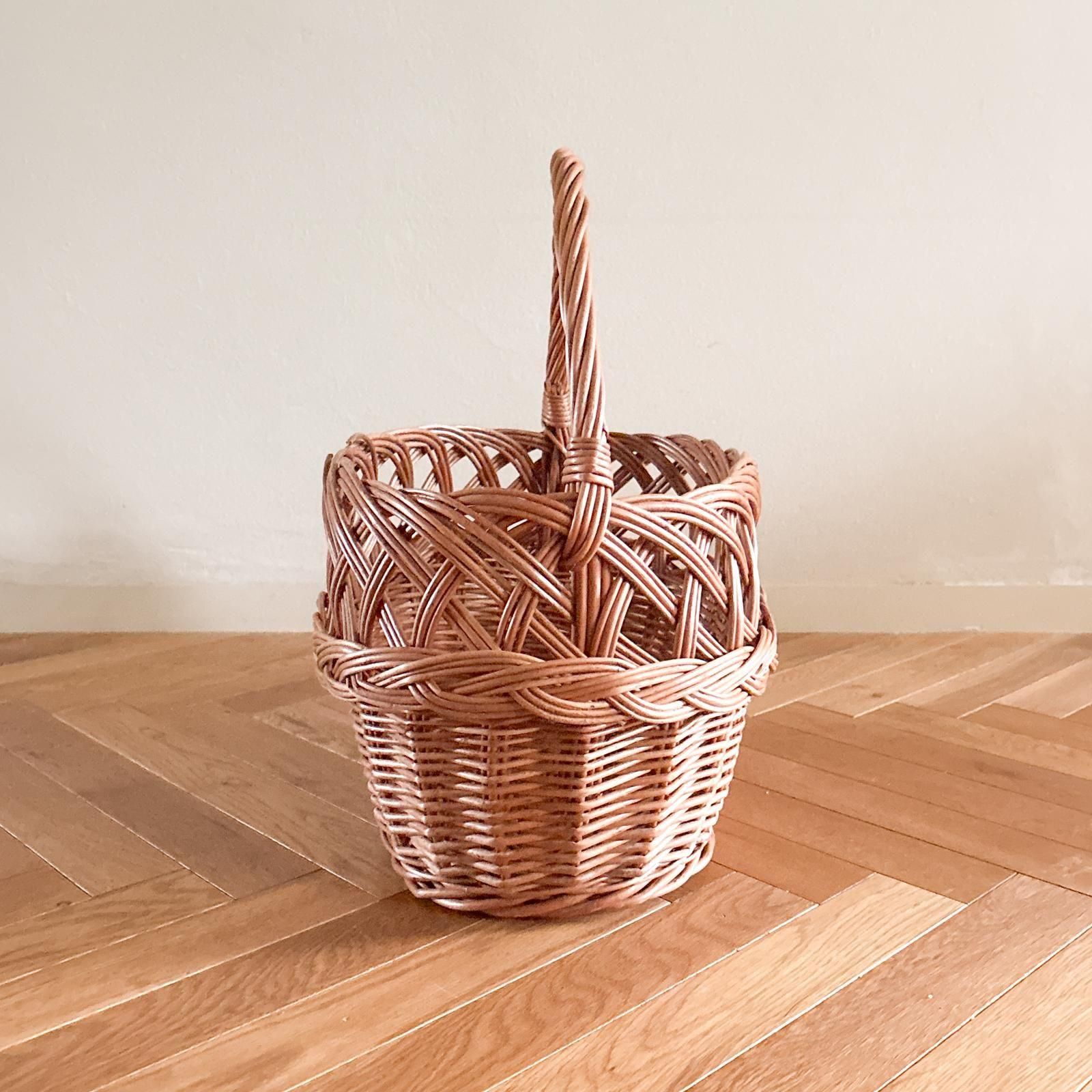 スウェーデンのヴィンテージバスケットです。しっかりと太さのある素材で編まれたオーバル型のバスケットです。上部は隙間が菱形に見えるように斜めに編まれ、三つ編み状の編み方で仕切られた下側はぎゅっと編まれた凝ったデザインです。オーバル形で深さがあるので容量たっぷりで使いやすいです。ピクニックに持っていったり、バスケットにいろいろ仕舞いながら部屋に置くと、見せる収納としていいインテリアにもなりますよ。