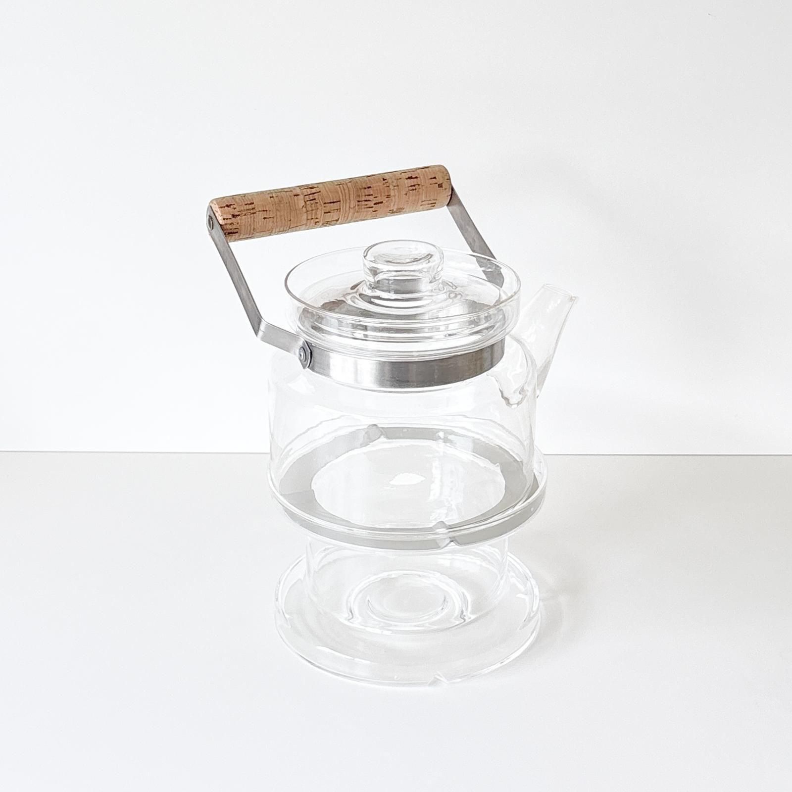 スウェーデンのプロダクトデザイナー、シグネ・ペーション・メリンがデザインし、1971年にBODA NOVA社から発売された耐熱ガラスシリーズのティーポットとウォーマーのセット、こちらはLサイズです。円柱形のすっきりとしたデザインのポットはマウスブロウ(宙吹き)によって作られたもの。そのため注ぎ口とフタそれぞれに個体差があり、ハンドメイドならではの魅力が感じられる逸品です。ウォーマーにカップインキャンドルを灯して、テーブルで温度をキープしながらゆったりとティータイムを楽しめます( 直火にはお使いいただけませんのでご注意ください)。