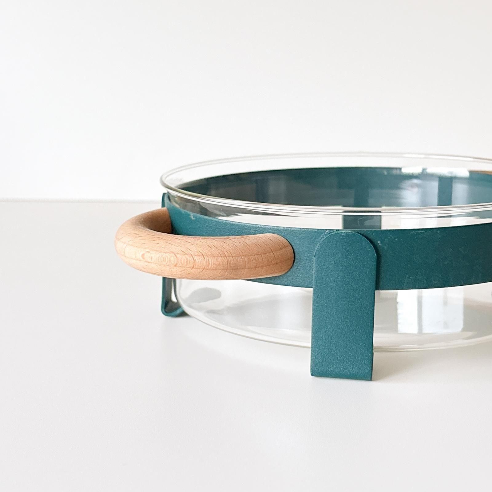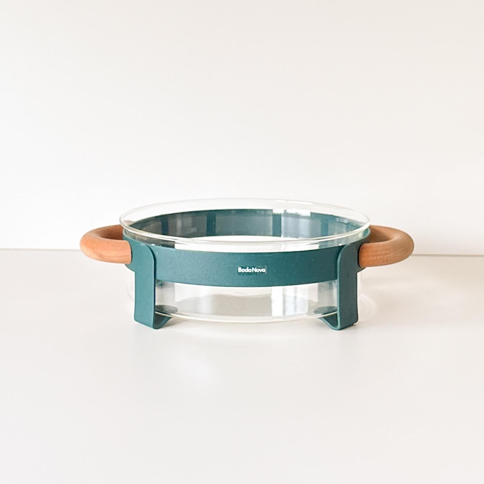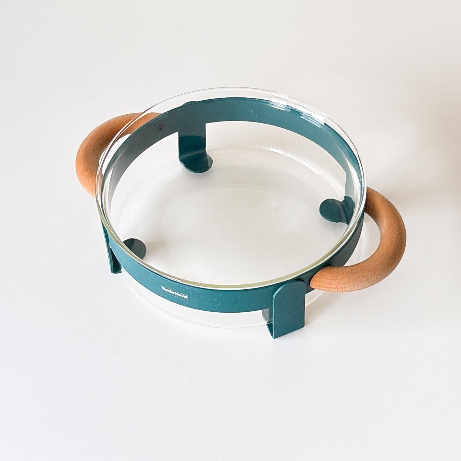 スウェーデンのBODA NOVAの耐熱ガラスのオーブンディッシュと専用ホルダーのセットです。ホルダーはモスグリーンに塗装された金属とハンドルには天然木が用いられた、北欧らしいスタイリッシュなデザインです。
